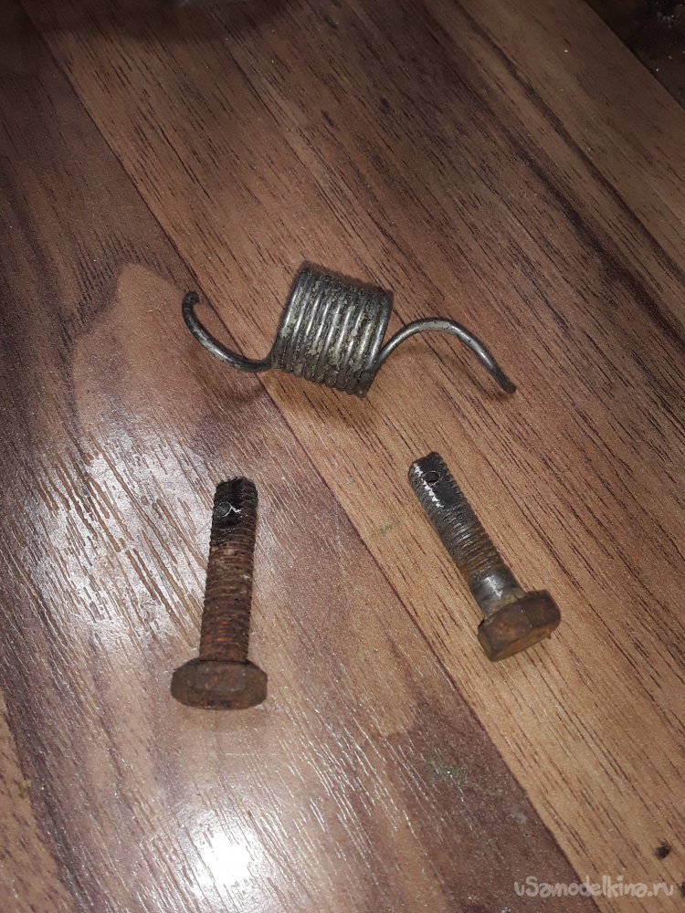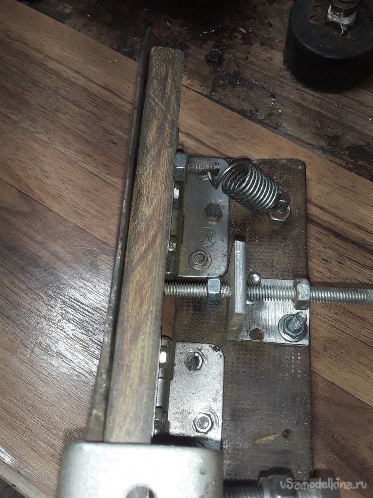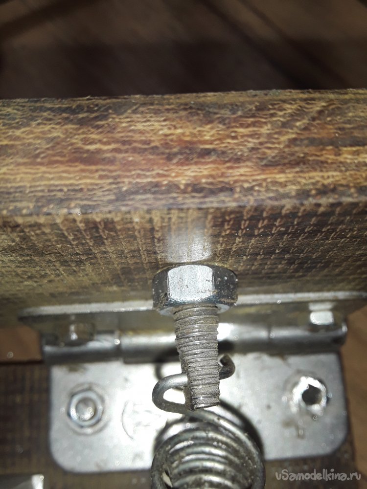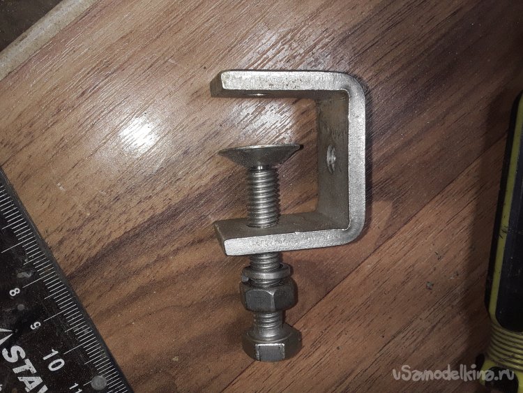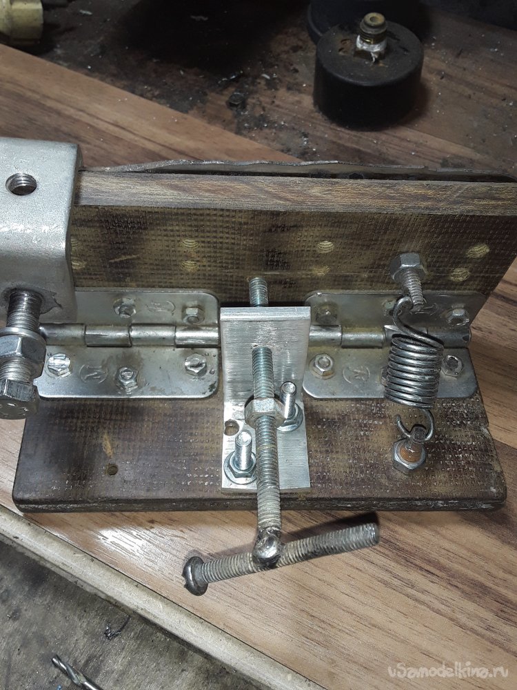 Для того чтобы все работало нужно установить пружину, а лучше две, но я нашел только одну. Нужно брать не сильно жесткуи чтобы не напрягаться и не сильно слабую чтобы все болталось. Для крепежа не стал заморачиваться просто, просверлил 2 противоположно друг другу отверстия и нарезал резьбу. Далее взял 2 болта длиной 2см немного сточил по краям и просверлил отверстие для ушка пружины. Отверстие немного рассверлил и закрутил болты на место потом на пружине согнул кольца и вставил в отверстие. Немного попробовал покрутит все вроде нормально и ровно осталось совсем малость. Струбцину я взял от какого-то крепления кабеля там длинный болт, а на нем 4 пластиковых зажима кабеля где-то 35мм и на конце болта такая вот хорошая и простая струбцина. Скорее влего, чтобы закреплять кабель на какой-то подвес, она очень удобно как раз подошла к приспособлению даже ничего не пришлось переделывать.