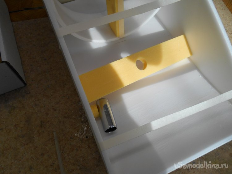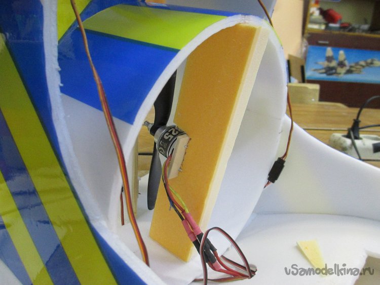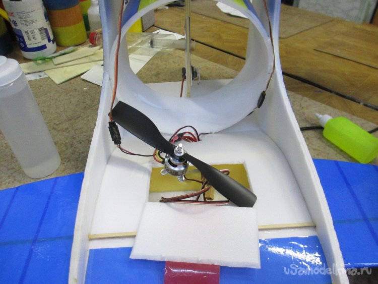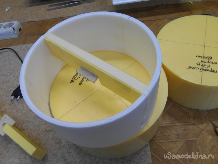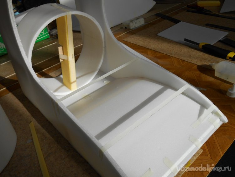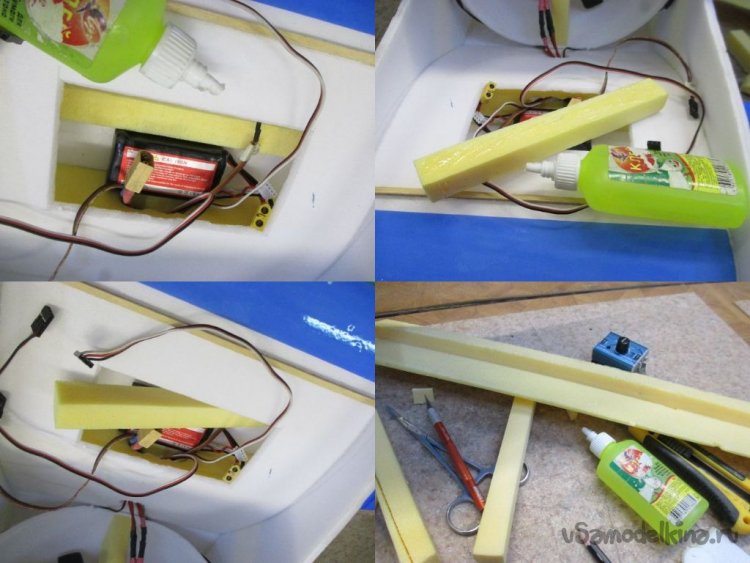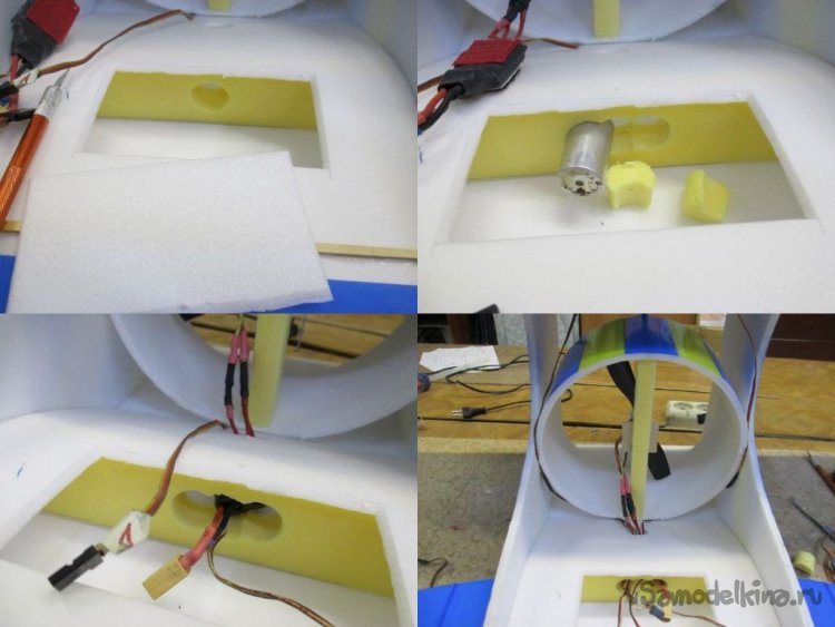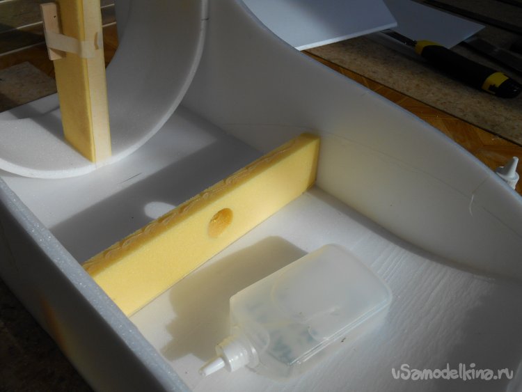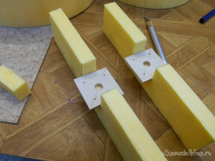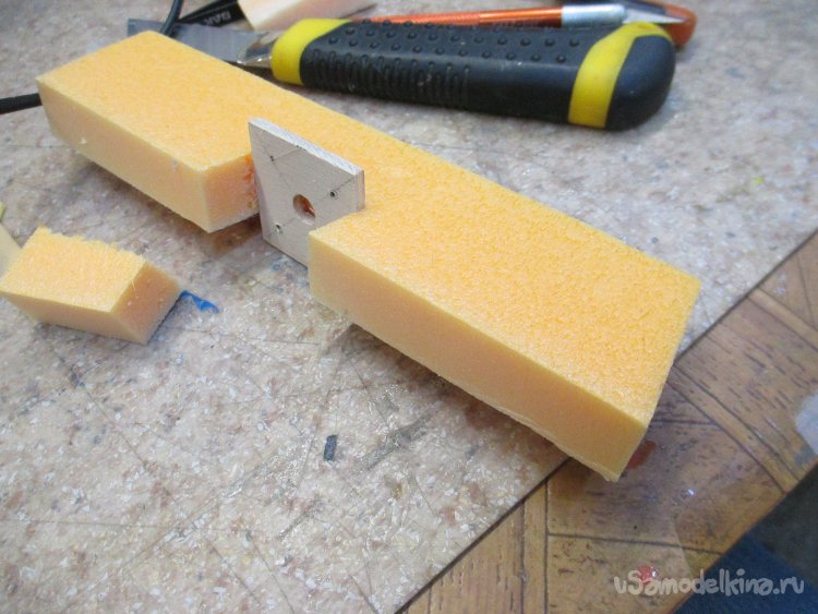 Из утеплителя толщиной в 20 мм вырезаю распорку в силовой отсек корпуса. При помощи остро заточенной трубочки высверливаю отверстие для прохода проводов управления на двигатель и сервопривод.