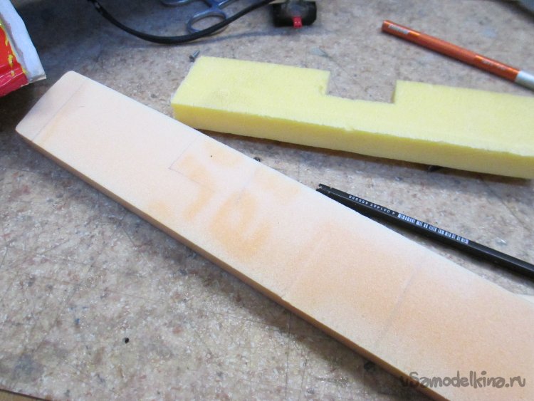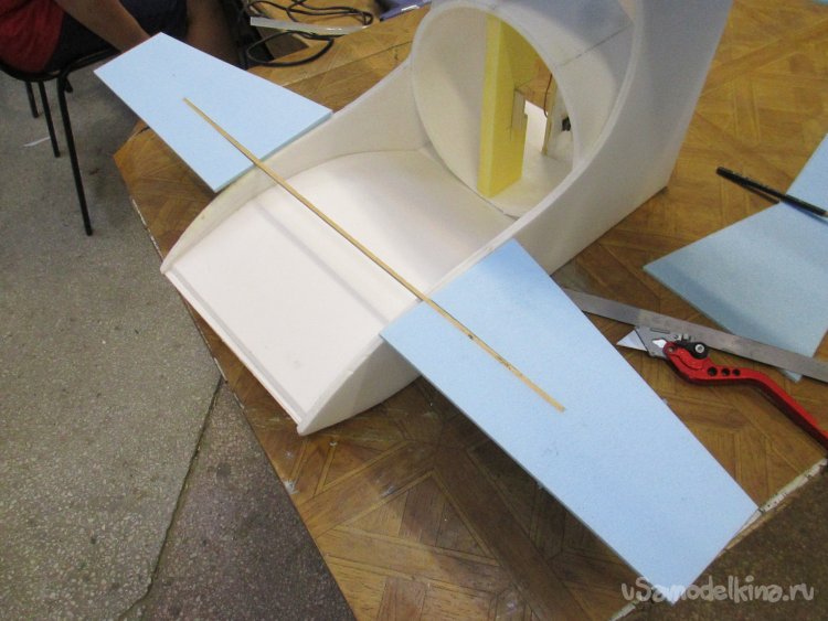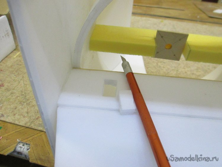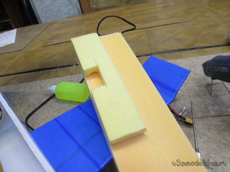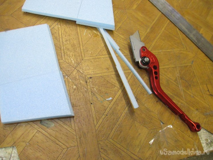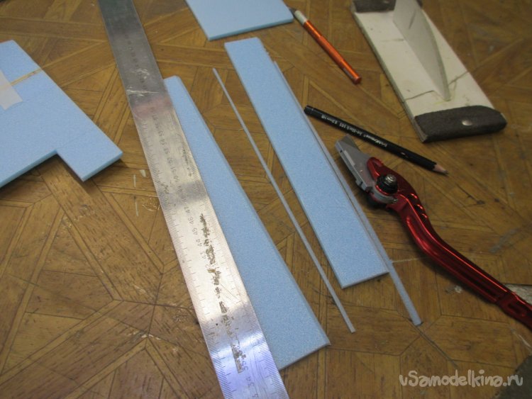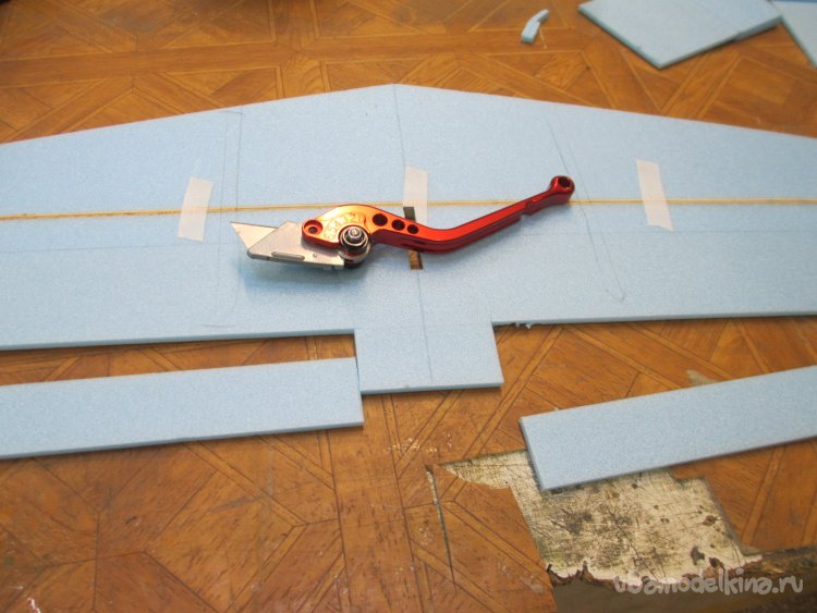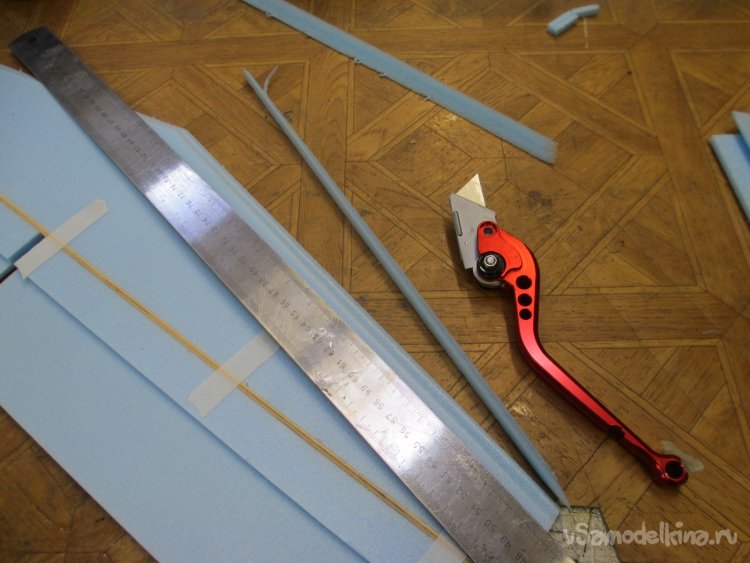 Затем прорезаю по разметке паз в руле. Но в пенопласте практически невозможно четко прорезать паз шириной в 0.5 мм. Поэтому после прорезки паза вставляю в него нож и повторно прохожу его, покачивая лезвие. Таки образом немного сминаются края и паз расширяется.