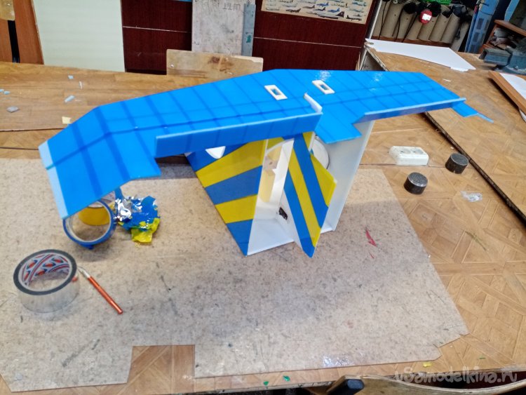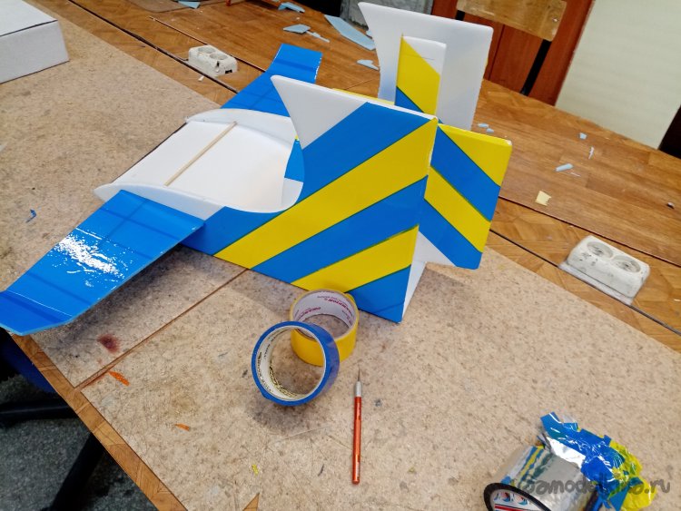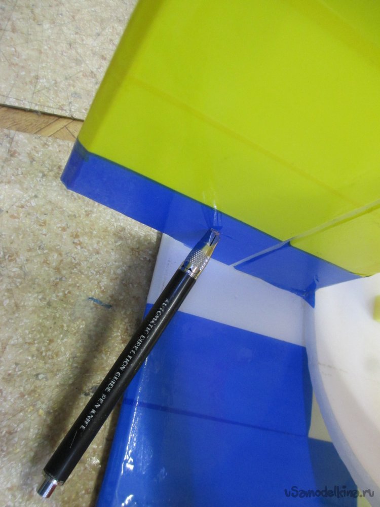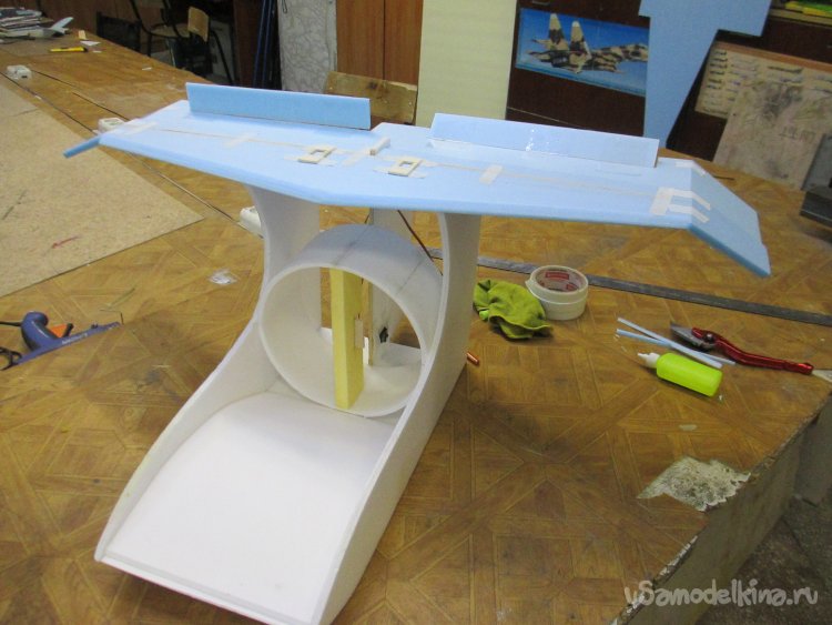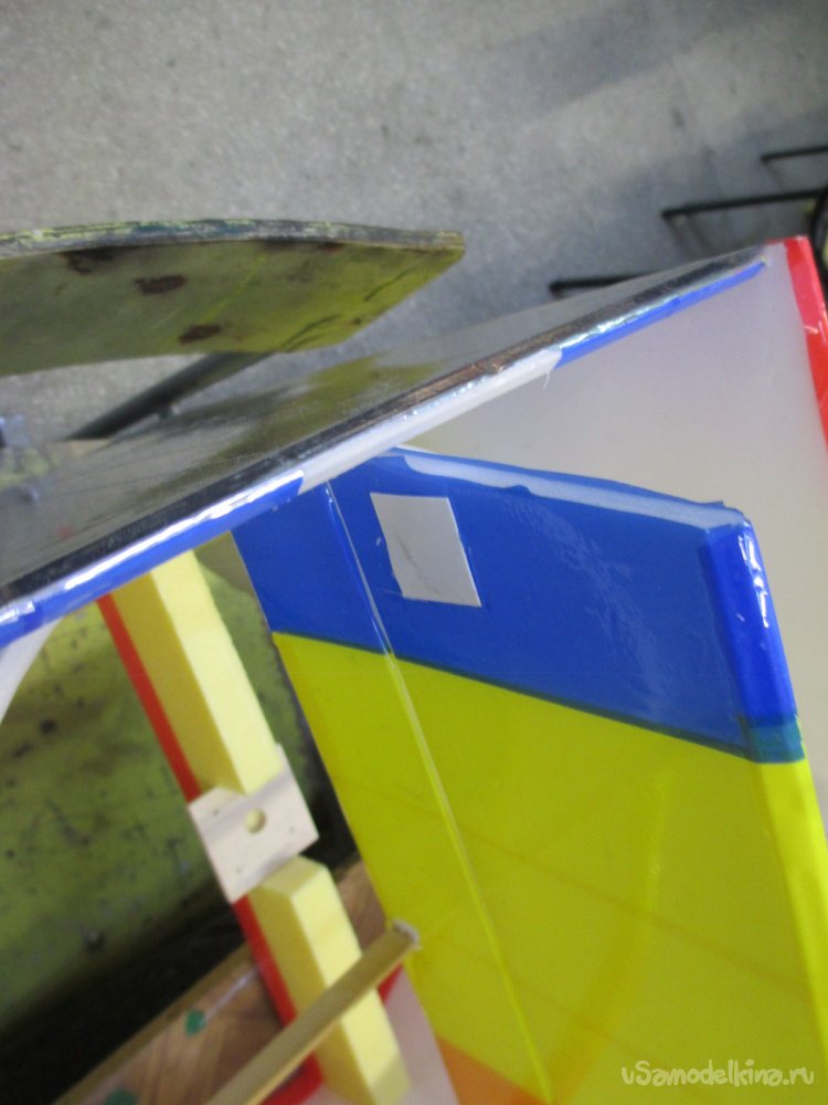 Отрезаю кончики передних крыльев и приклеиваю их под углом вверх. Собираю конструкцию на клею титан, все фиксирую малярным скотчем и монтирую на носовую часть корпуса.