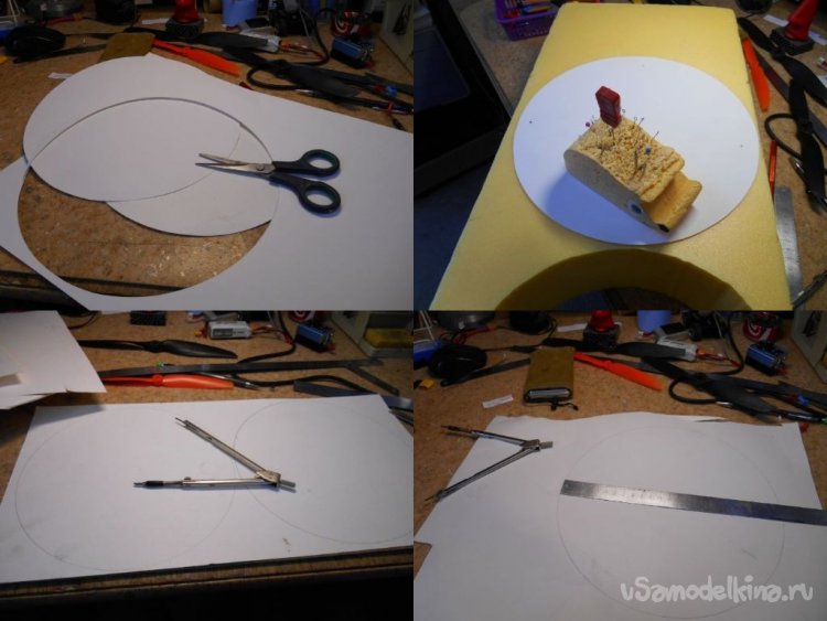 Первым делом нужно изготовить круг. Защиту винта, который часто страдает при переворачивании этой «бешеной колесницы». Но круг из потолочной плитки изготовить достаточно проблематично. Нужна оправка, типа круга. Для начала изготовления оправки беру размеры винта, которые она будет защищать. Винт планирую использовать двух размеров. 9х5 и 8х6. Но все-таки остановлюсь на большем диаметре. Маленький можно установить в большую оправку, большой вряд ли удастся. В данном проекте не буду рассматривать увеличение тяги винта работающем в кольцевой оправке. У меня все попроще будет.