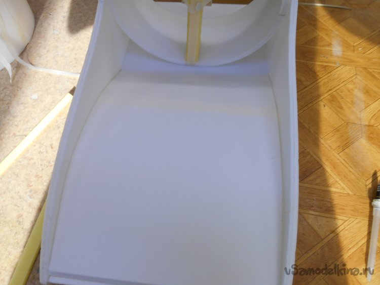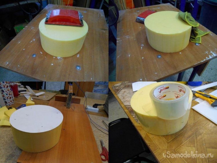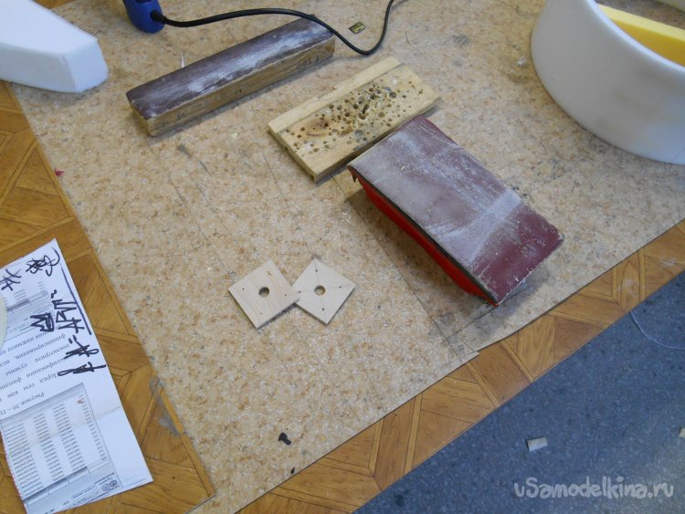 После высыхания, закругляю острые бортовые грани днища при помощи утюжка со шкуркой. Протираю весь корпус влажной тряпочкой от пенопластовой пыли.