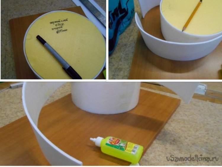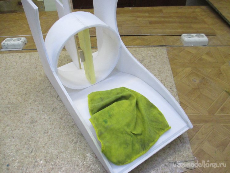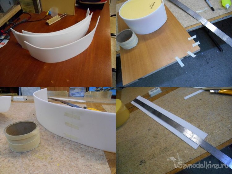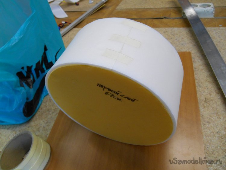 Само защитное кольцо склеиваю из полос потолочной плитки. Если присмотреться внимательнее она имеет разную гибкость по стонам. Поэтому выбираю именно хорошо гнущуюся сторону и режу на полосы в 10 см шириной. Но одного размера в 20 см не хватит для того, чтобы полностью оклеить окружность. Придется склеивать полосы в торец. Путем тщательных замеров определил длину полосы на первый слой в 67 см. Полоса второго слоя имеет длину с 69 см и 5 мм. Чтобы пенопласт не сильно пружинил при оклейке, немного изгибаю полосы протяжкой о край стола. Немного приминая его руками. Отрезаю в размер первую полосу, тщательно прижимаю её к оправке, склеиваю встык. Соединение фиксирую при помощи малярного скотча.