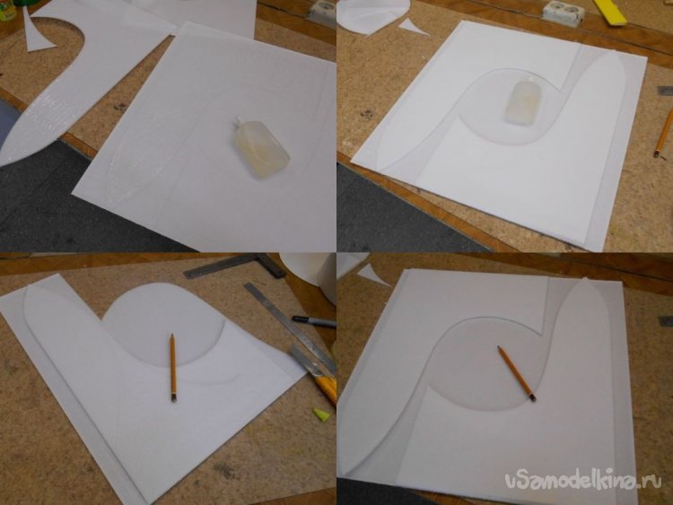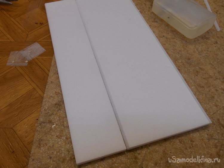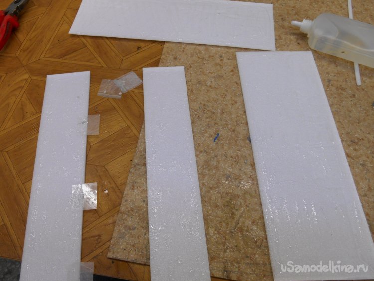 Затем приступаю к изготовлению самого корпус, а аэросаней. В этом случае стенки будут дополнены высокими вертикальными стенками. Есть способ получить одинаковые заготовки. Вырезаю парочку одинаковых стенок. Затем при помощи нашего любимого клея титан приклеиваю на потолочную плитку и отрезаю по контуру. Получаются стенки в два слоя потолочной плитки.