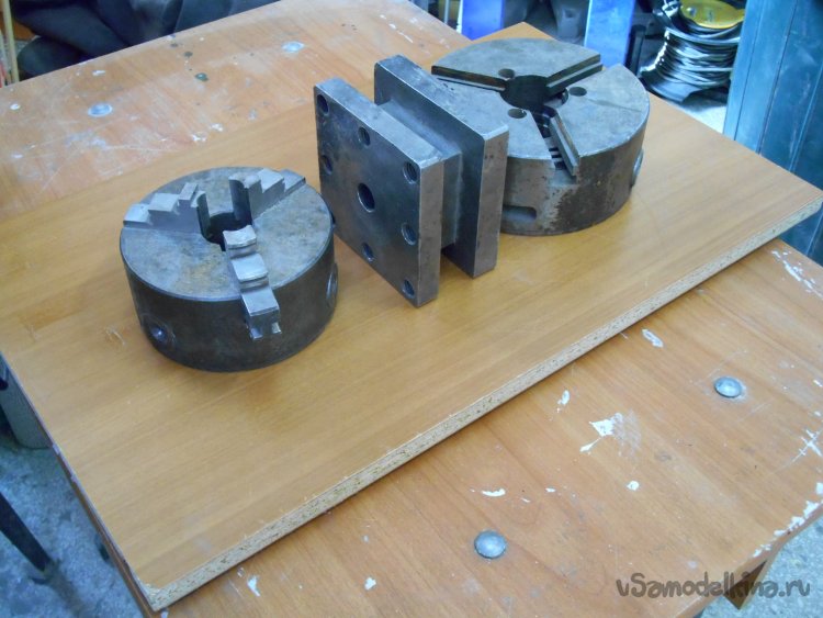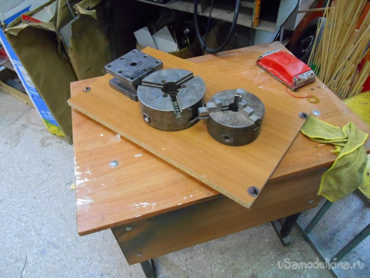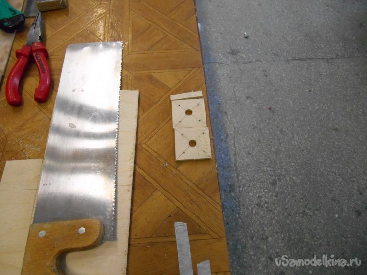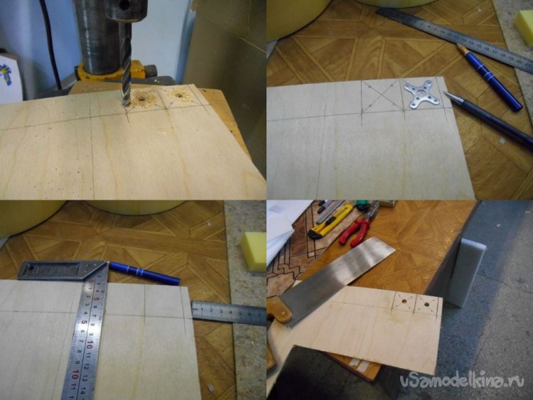 Из шлифованной 4 мм фанеры выпиливаю заготовку моторамы Размером 40 х 40 мм. Не разрезая фанеры, сразу размечаю положение мотора и просверливаю небольшие отверстия для шурупов крепления мотора. Посредине разметки еще одно большего диаметра. Для вала мотора. У некоторых образцов, он выдается в тыльной стороны моторамы. После сверлильных работ бодро распиливаю размеченную заготовку на квадратики. Сверление на неразрезанной фанерке гораздо легче. Чем на маленьких квадратиках. Удобнее держать.