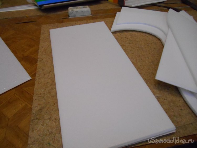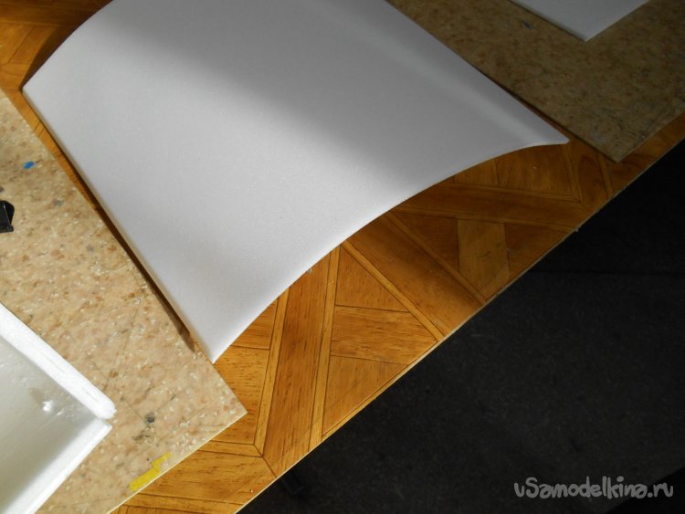Из одного слоя потолочной плитки вырезаю палубу корпуса. Для удобства вклеивания немного изгибаю её о край стола, немного придавливая руками. Потолочная плитка не равномерно гнется по двум направлениям. Нужно выбирать в каком положении она гнется лучше, иначе может трескаться при сгибании.