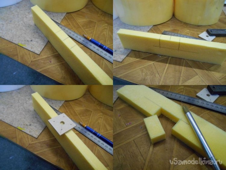 Из утеплителя толщиной в 20 мм отрезаю стойку моторамы. Стойка точно размером точно по диаметру защитного кольца. Поскольку будет устанавливаться внутри его. На одной и граней стойки размечаю положение моторамы. Точно посредине. Иначе винт будет задевать за внутренние стенки кольца. Вылезаю, углубление и вклеиваю мотораму на место.