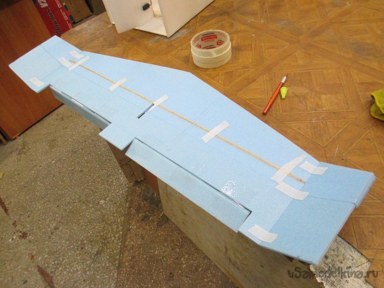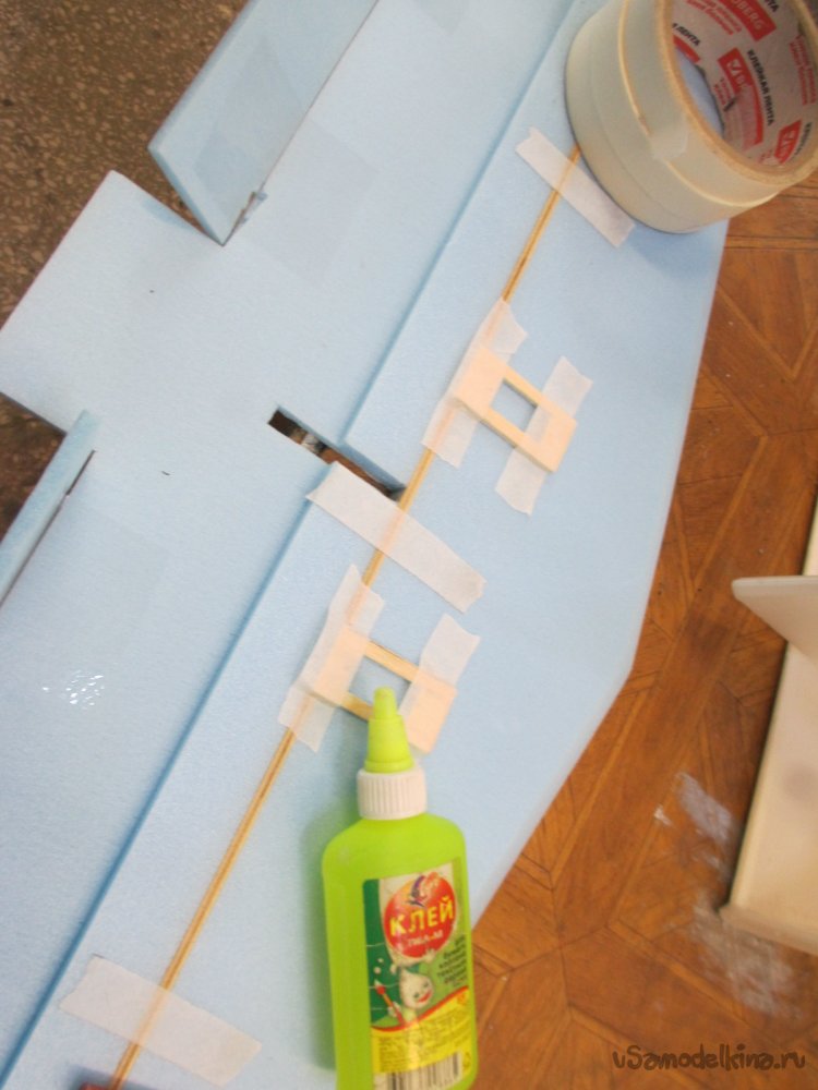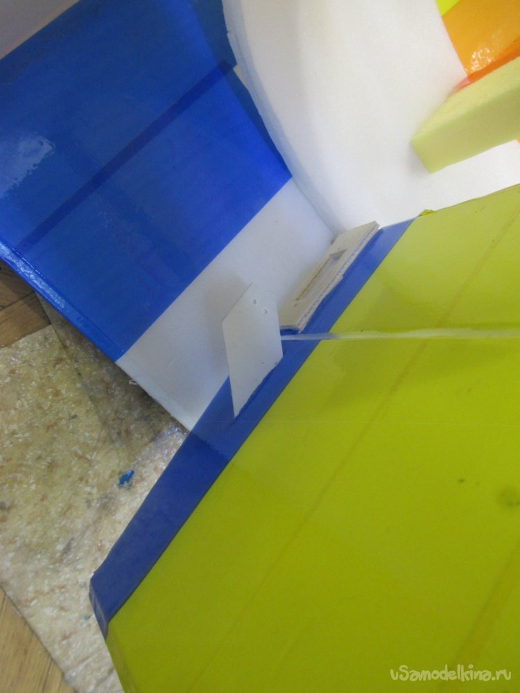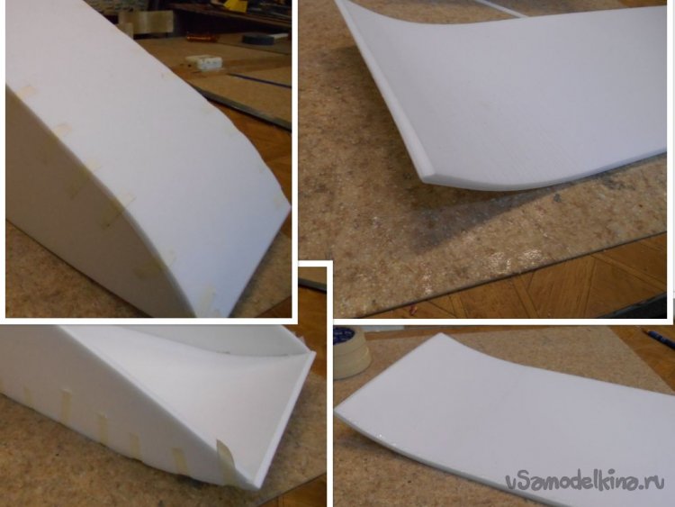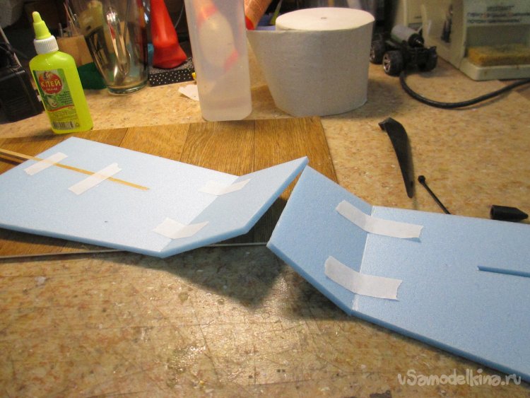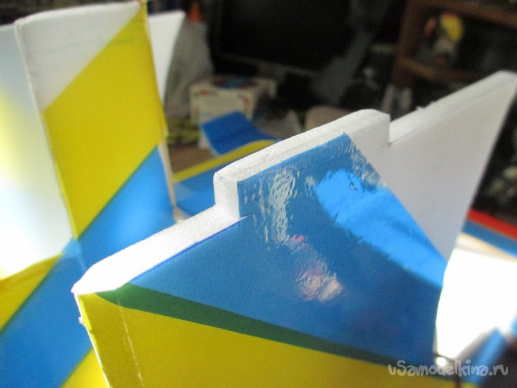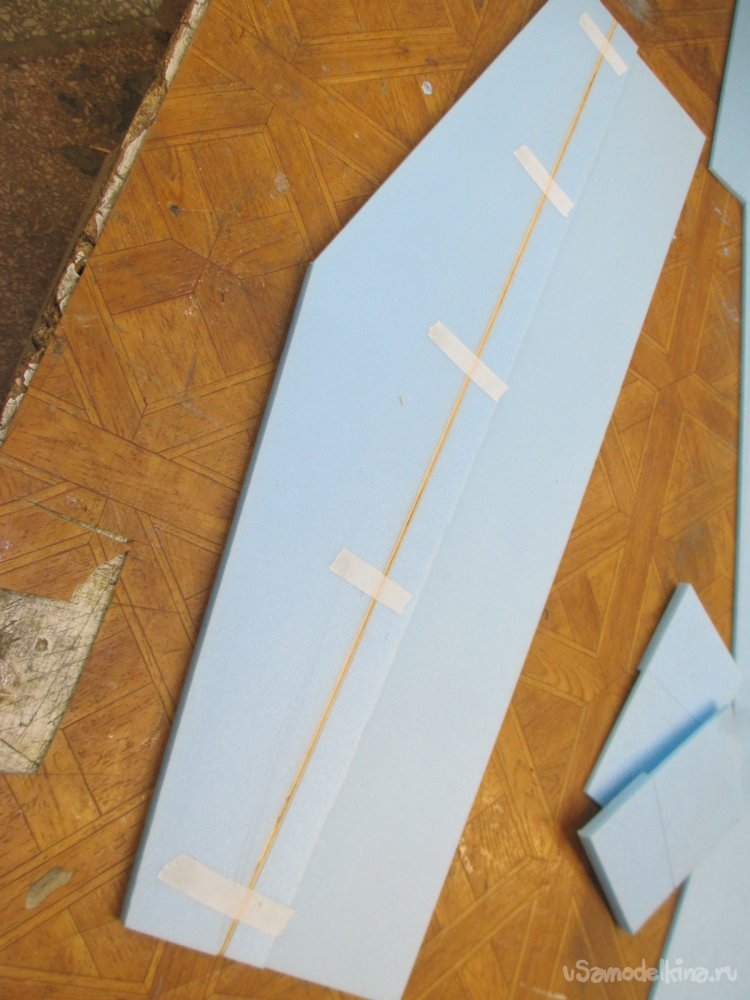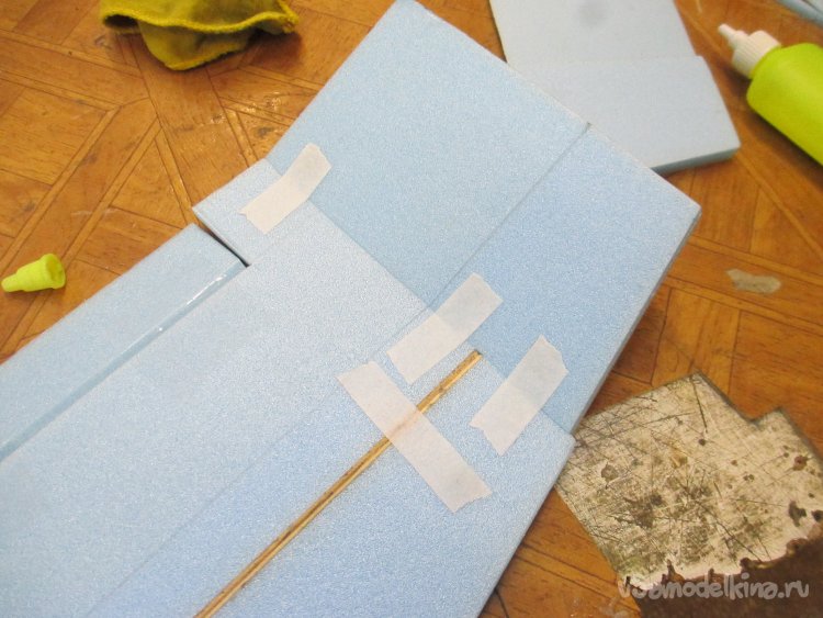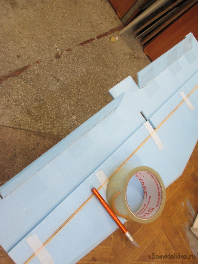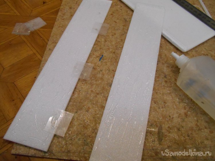 Для изготовления законцовок крыла дополнительно склеиваю парочку элементов. Из подложки под ламинат с таким же профилем. Концы отрезаю под углом. Наношу клей и фиксирую законцовки малярным скотчем.