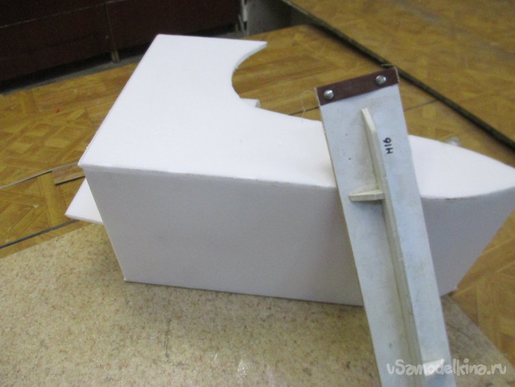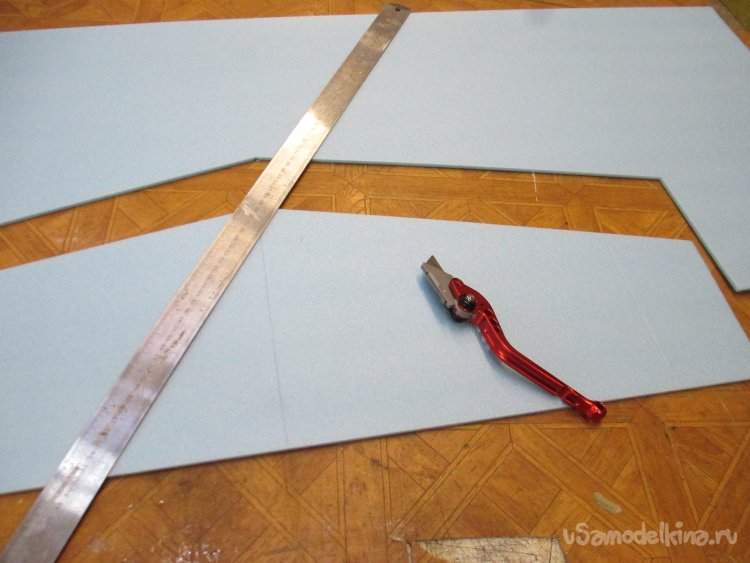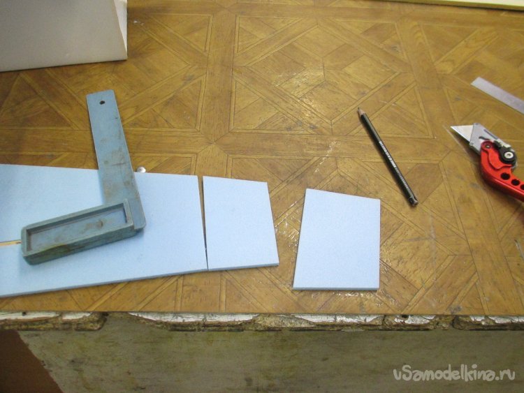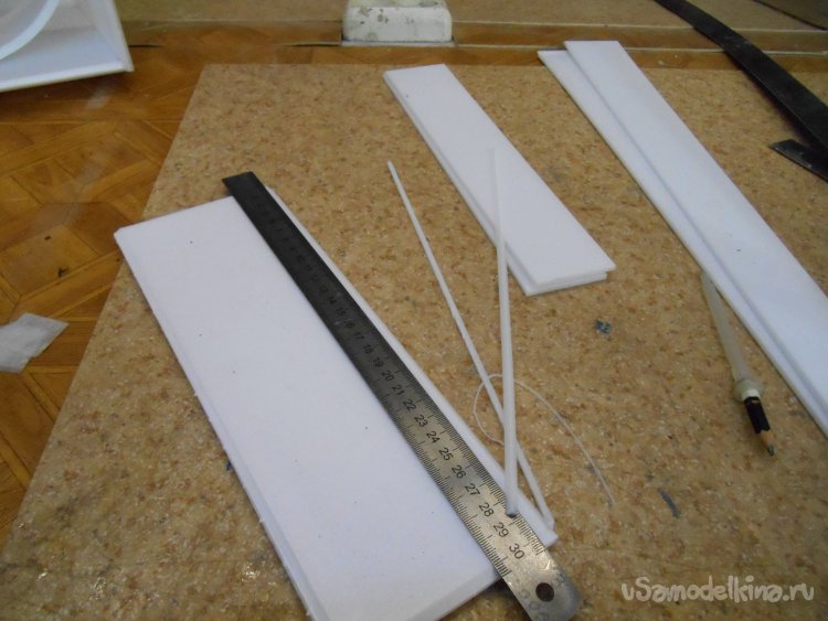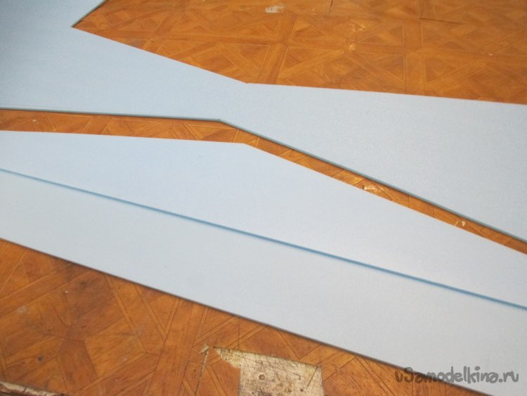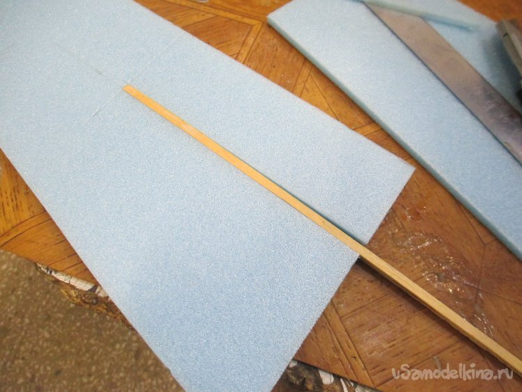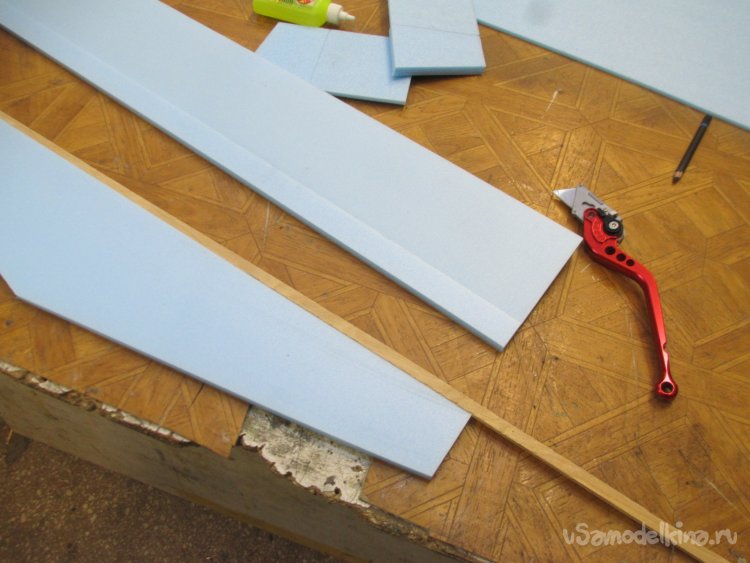 Стойку руля направления и само перо буду делать из двойной потолочной плитки. Вырезаю заготовки с некоторым припуском. У заготовки пера руля срезаю кромки, прилегающие к стойке, под углом в сорок пять градусов. Это позволяет ему плотно прилегать к стойке и независимо поворачиваться в стороны на указанные градусы.