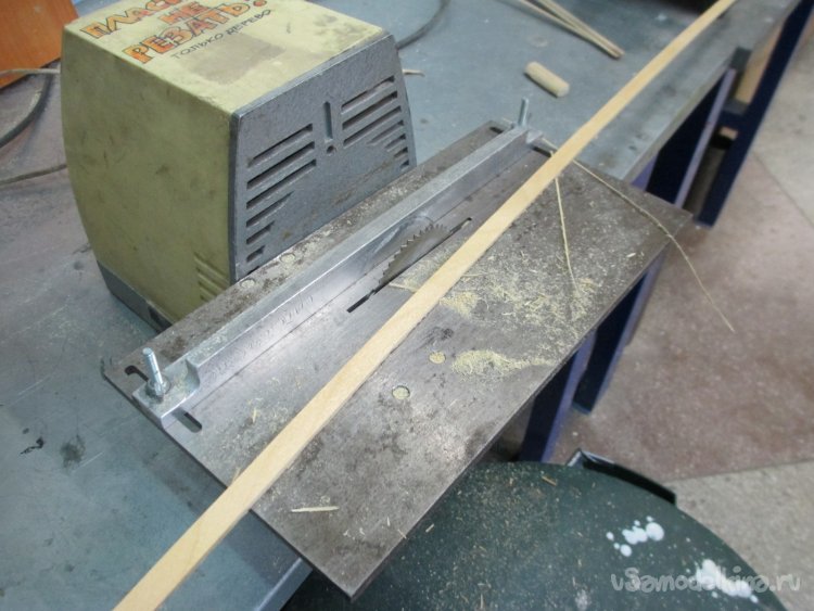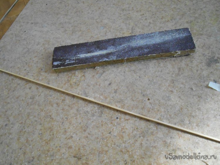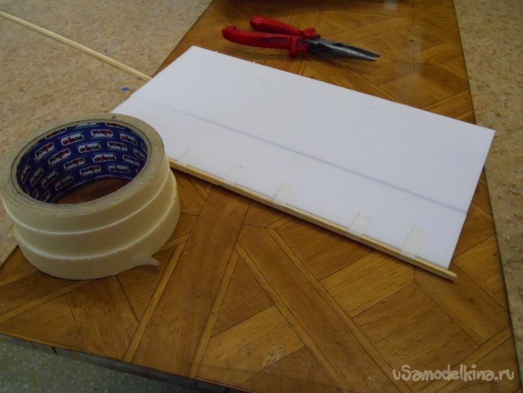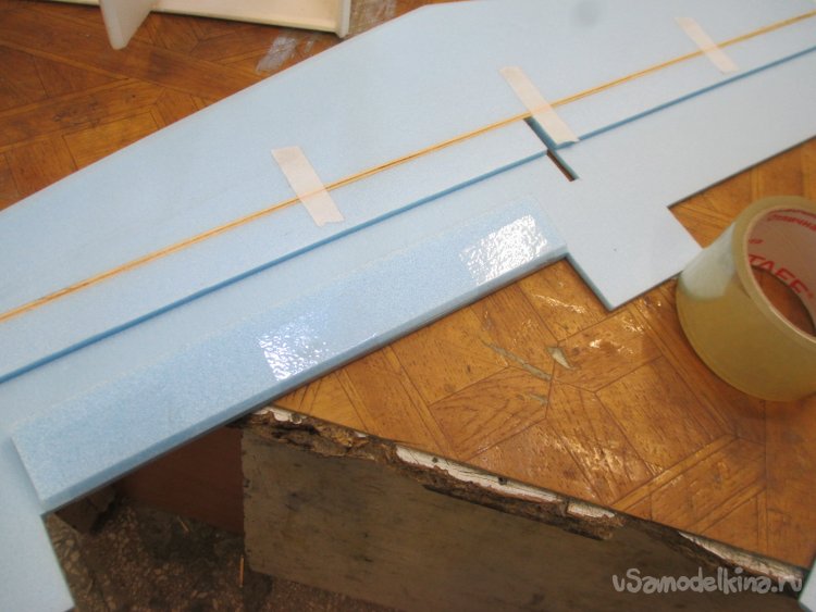 На пиле готовлю рейку толщиной в 3 и шириной в 5 мм. Немного обрабатываю при помощи шкурки. Разрезаю крыло и вклеиваю рейку усиления. Стягиваю заготовку малярным скотчем с двух сторон. Предотвращаю коробление при склейке.