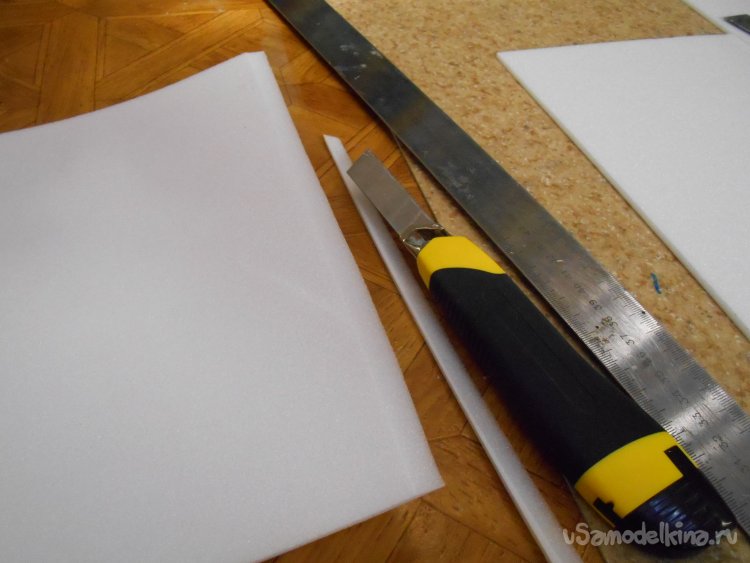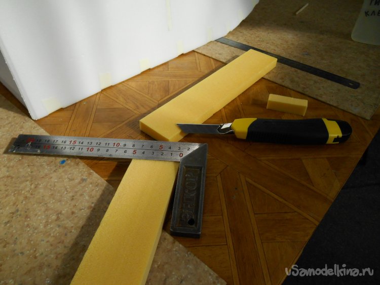 Вырезаю из подложки под ламинат парочку крылышек. Для прочности приготовил рейку сечением 5х5 мм. Вырезаю в крыльях паз нужного размера. Собираю конструкцию, примеряю по месту.