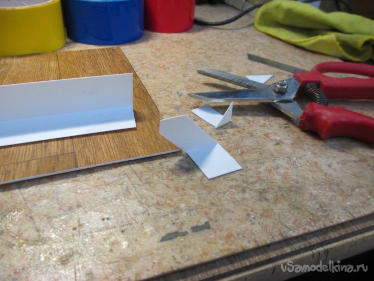 Из белого, пластикового строительного уголка вырезаю кабанчики для руля управления. Он очень хорошо режется простыми ножницами по металлу.