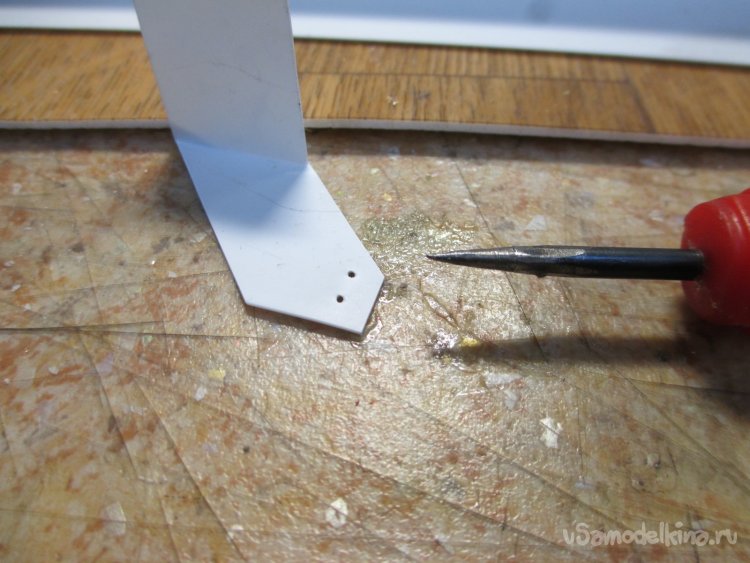 Шилом прокалываю парочку отверстий для установки тяги управления. Два нужны для корректировки угла отклонения пера.