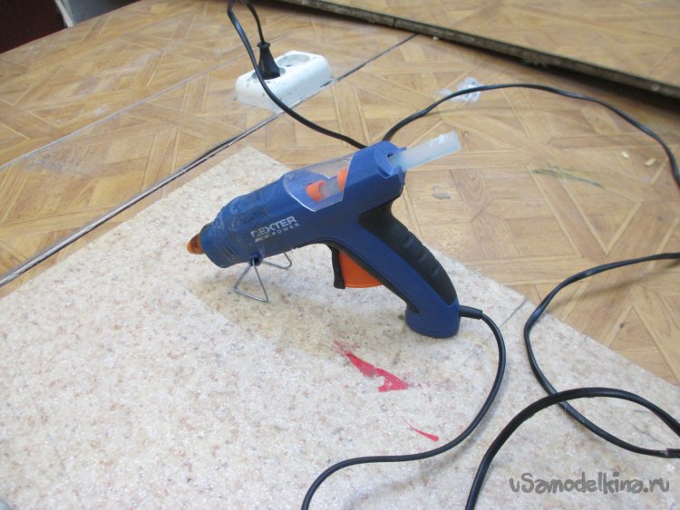 Приклеивать кабанчик буду на термоклей. Причем есть тонкость. Клей нужно наносить не на пенопласт, а на пластик кабанчика. Таким образом, снижается вероятность подплавления детали.