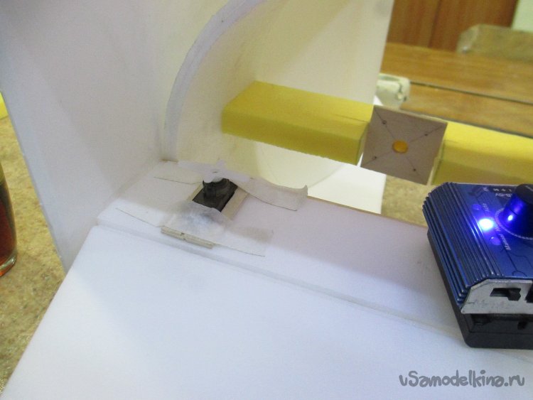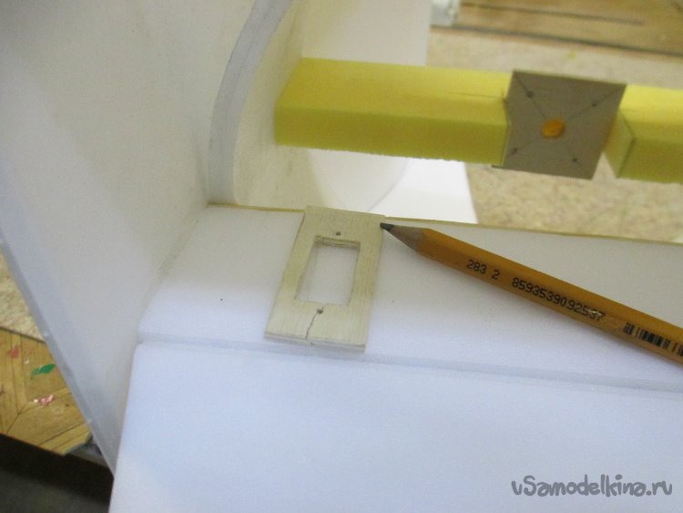 Выпиливаю из фруктовой фанеры рамку установки. По месту размечаю. Прорезаю в пенопласте отверстие для установки сервопривода. Рамку немного прошкуриваю. Поскольку установка сервопривода на месте затруднительна, сразу закрепляю его на рамке. Затем всю конструкцию приклеиваю на место на титан. Фиксирую при помощи малярного скотча.