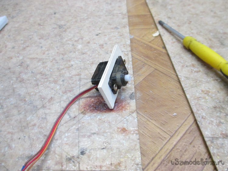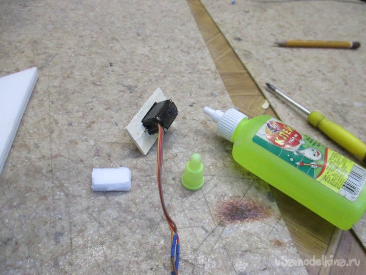 На стойку руля направления нужно установить сервопривод. Выбираю простой вариант весом в 9 грамм. Перед установкой обязательно проверяю его при помощи сервотестера.