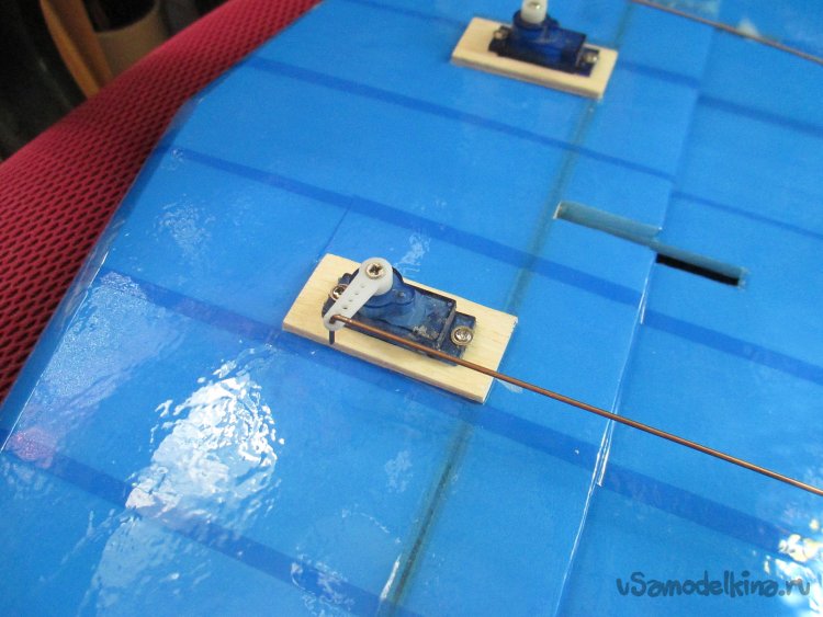 Заодно на снятом крыле установил кабанчики, винтил на место проверенные сервоприводы. Приклеил на термоклей кабанчики и провел тяги управления из сварочной проволоки сечением в 1.2 мм.