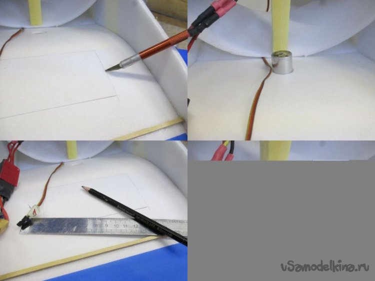В палубе размечаю положение люка для доступа в «трюм». Прорезаю детальки. Держа нож наискосок в несколько градусов. Таким образом, крышка люка не может провалиться внутрь. При помощи заточенной трубочки привертел отверстие для проводов управления рулем поворота, элевонов и силовых проводов от регулятора на двигатель.