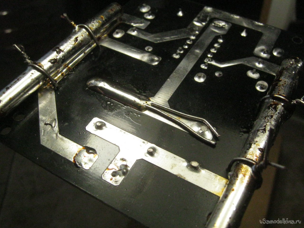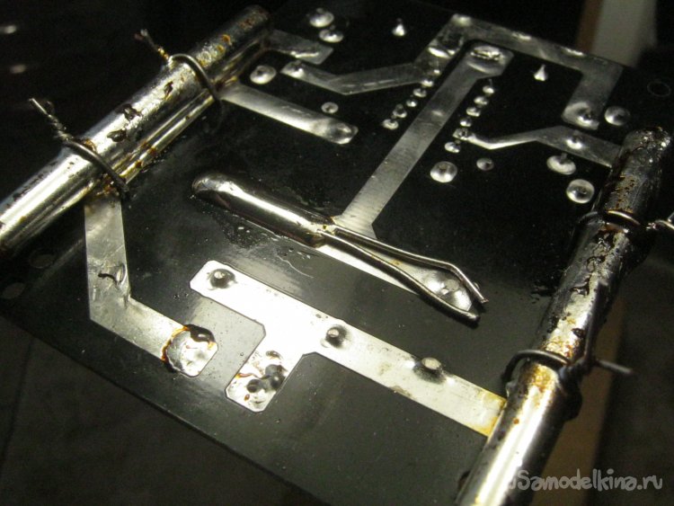 Фото 9. Выпаял табельные клеммные колодки для индуктора и питания. Усилил силовые дорожки – уложил на них по два куска нетонкой медной луженой проволоки, припаял в нескольких местах, наплавил паяльником ровный равномерный валик припоя. Готовую платку промыл от остатков спиртоканифольного флюса – старой зубной щеткой с ацетоном. На открытом воздухе, в защитных очках – короткая жесткая щетина склонна разбрасывать капли и даже мельчайшая из них попавшая в глаза - переживание не самое приятное.