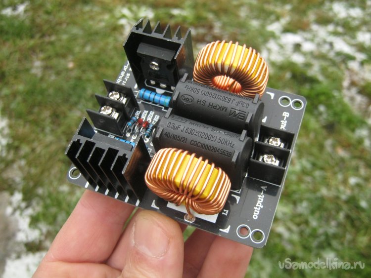 Традиционно в ТВЧ применяли радиолампы – мощные генераторные тетроды-пентоды, что автоматически вело к громоздким компонентам, весьма высокому напряжению и изрядной потребляемой мощности – одни накалы чего стоят! Современные полупроводниковые низковольтные преобразователи много компактнее и экономнее. Для своих нужд подобрал готовый модуль на Али Экспресс – низковольтный транзисторный обратноходовый преобразователь – автогенератор ВЧ, для индукционного нагрева и забав с катушками Тесла (Фото 2).
