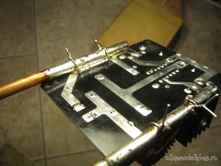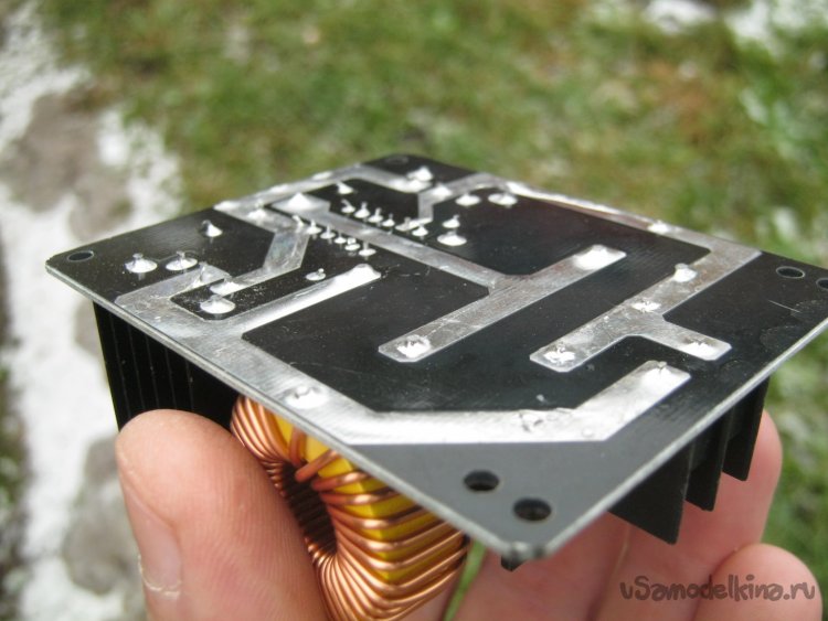 Фото 8. Длину выводов индуктора уточнил по месту, обрезал лишнее, зачистил некрупной наждачкой, залудил. В свободных от элементов сверху, местах платы просверлил по паре некрупных отверстий, закрепил выводы луженой медной проволокой, пропаял мощным паяльником с небольшим подогревом пламенем горелки. При необходимости концы трубчатого индуктора могут быть без труда сформованы для удобного подключения шлангов водяного охлаждения.