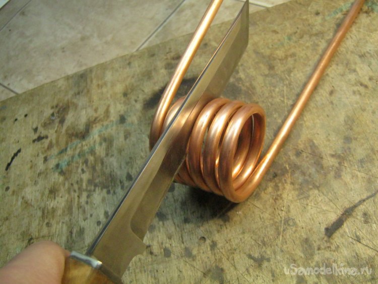 Индуктор. Намотал на оправке диаметром 40 мм медной трубкой диаметром 6 мм. Трубка кондиционерно-холодильниковая, мягкая. В качестве оправки применил ровную часть баллона лампы ГУ-50 (Фото 6).