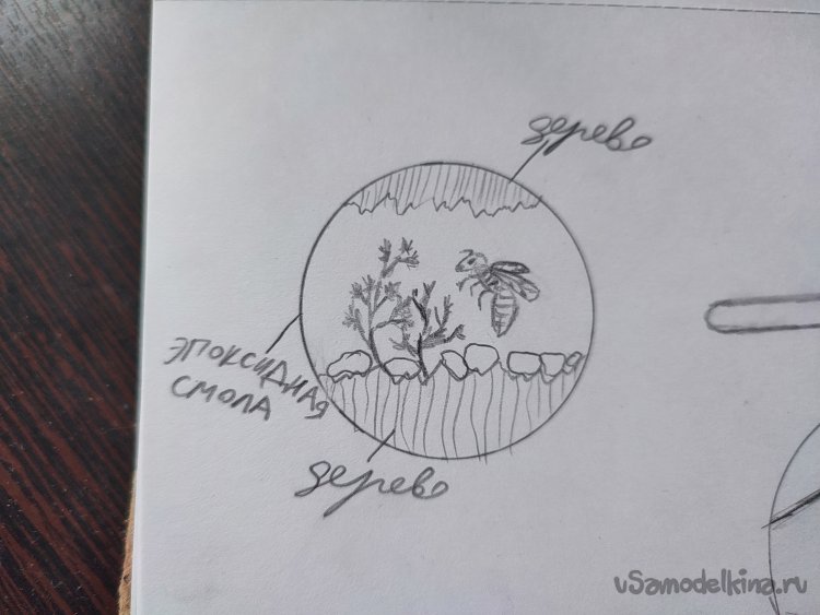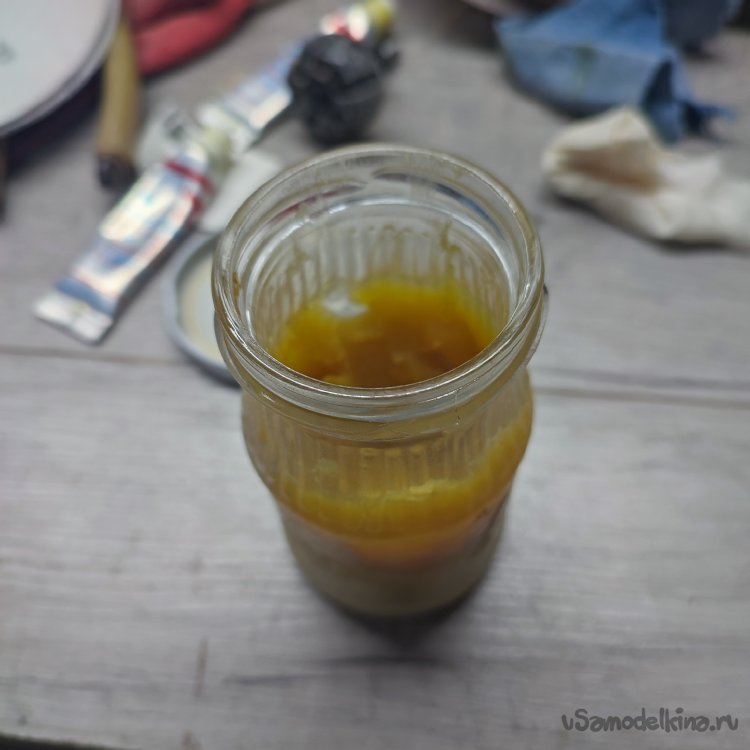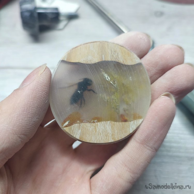 Эпоксидка. Ее развел, как и полагается по инструкции, 2:1, и залил это дело аккуратненько, выгоняя пузыри. Чуть позже я растворил в части эпоксида немного желтой масляной краски, чтоб, собственно, окрасить ее. И добавил эдакую имитацию пыльцы к растению, чтоб еще больше желтого цвета было.