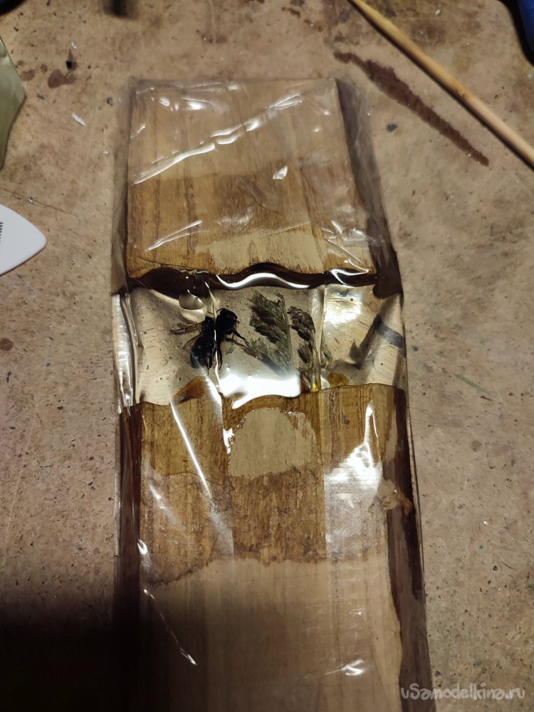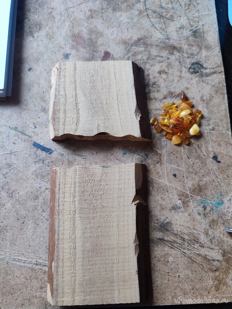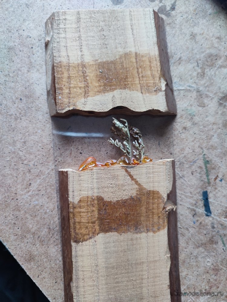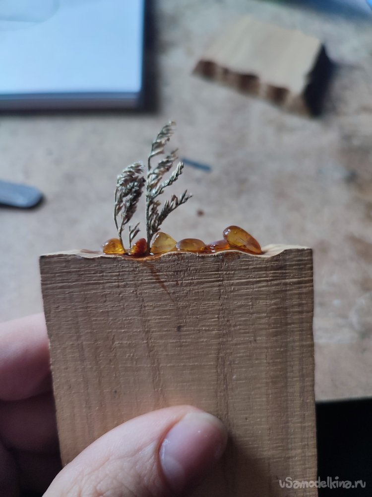Итак, для начала я распилил и придал неровностей облепиховой дощечке. Сломать ее трудно было из-за сантиметровой толщины и гибкости дерева. Ну и начал собирать на ней эдакую диораму из янтаря и цветочков на суперклей.