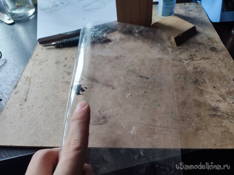 Теперь надо сделать опалубку для заливки эпоксида. Я использую пластик от плотных обложек для документов. Он легко клеится суперклеем, но абсолютно не липнет к эпоксиду. Это то-ли полиэтилен, то-ли что, точно не знаю.