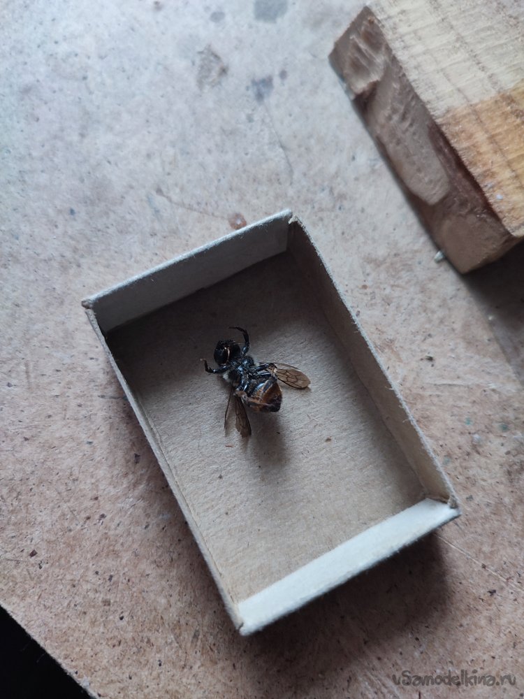 Теперь в бой вступает сама пчела. С ней было много мороки. Распаривать, выравнивать и сушить полгода, как и полагается насекомым, у меня не было ни сил, ни сноровки, ни времени, поэтому работал с тем, чем мог. Еле как перенес ее в диораму, чтоб не сломать, и приклеил на суперклей.