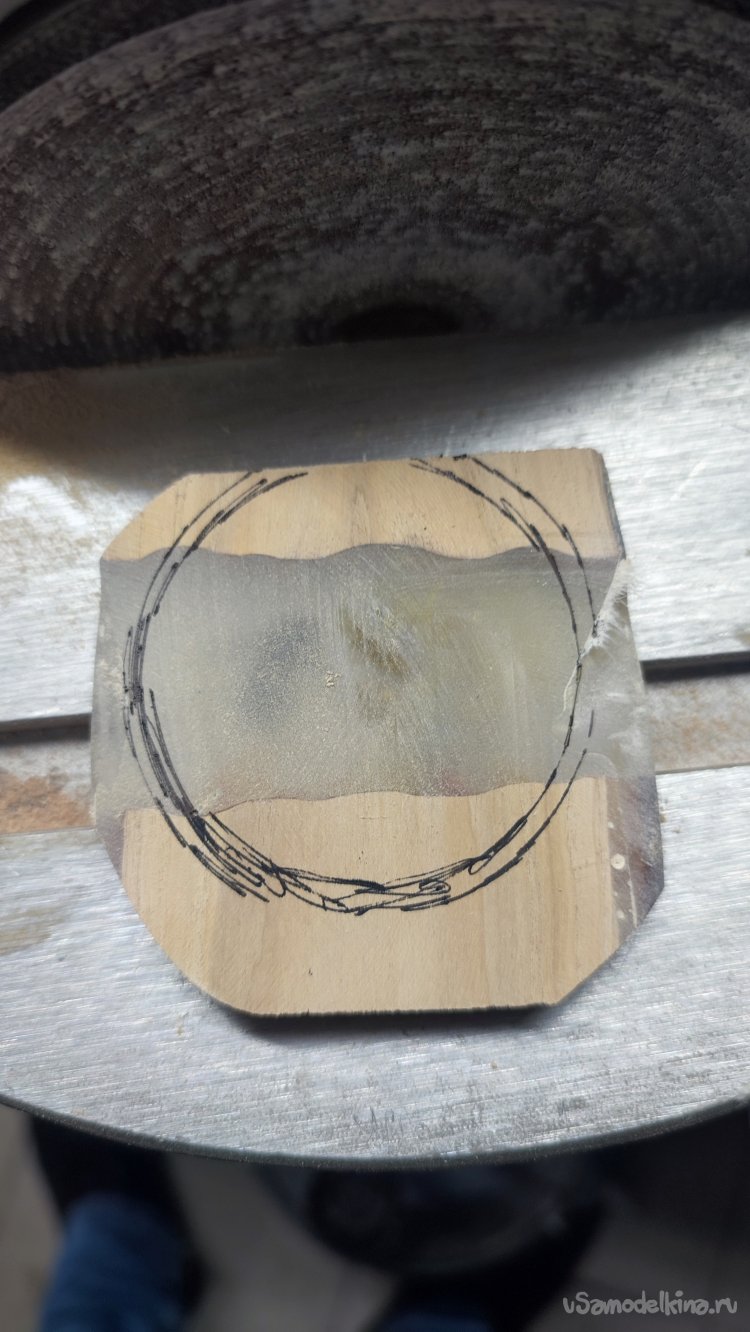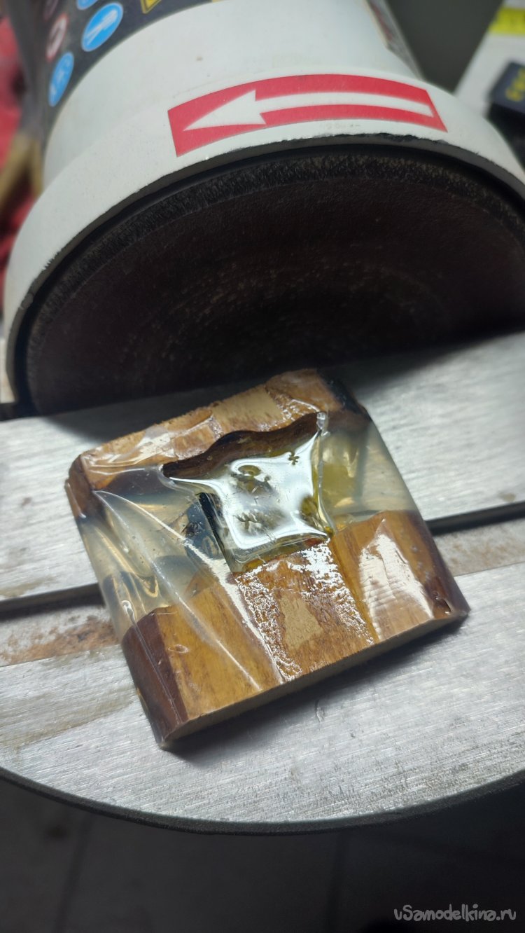 Тут-то и началась заварушка. Эпоксидка довольно застарелая, и при том, что я добавил отвердителя чуть больше, чем надо, она нормально не затвердевала где-то 4 дня. Хотя этот состав можно обрабатывать через 48 часов. Впрочем, она потом затвердела до нормальной кондиции, а через еще 2 дня была уже твердой, как и полагается. Тем временем я уже перебрался в мастерскую для создания самого амулета.
