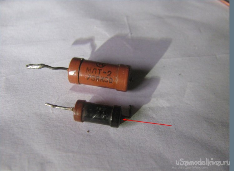 Резистор у меня на 15 Ом, видно, что он не самый большой, а «средний», но лучше брать наверно побольше, работать удобнее и тепловую нагрузку он лучше выдержит. При подключении к АКБ резистор накалится, и будет дымить, обгорит краска. В завершении зачищаем его наждачкой, чтобы повысить теплопроводность.