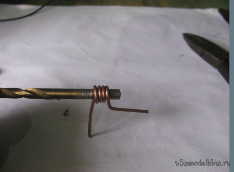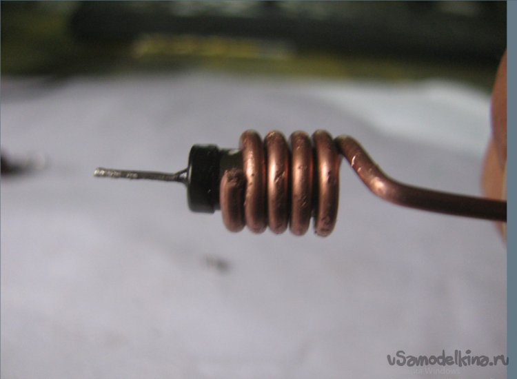 Берем кусок медной проволоки 3 мм и наматываем на сверле спираль. Далее эту спираль надеваем на резистор и немного обжимаем плоскогубцами, подматываем еще при надобности. В итоге спираль крепко держится и не спадает. Один контакт можно намотать на жало, но у меня от отвалился.