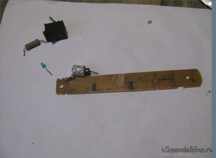 Прикручиваем концы питающего кабеля, сам кабель тоже можно прикрутить проволокой. Устанавливаем подальше от нагревателя кнопку включения, тут уже можно применить горячий клей. Также я через сопротивление подключил светодиод, он горит, когда паяльник включен, это помогает не забыть его выключить.