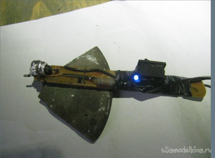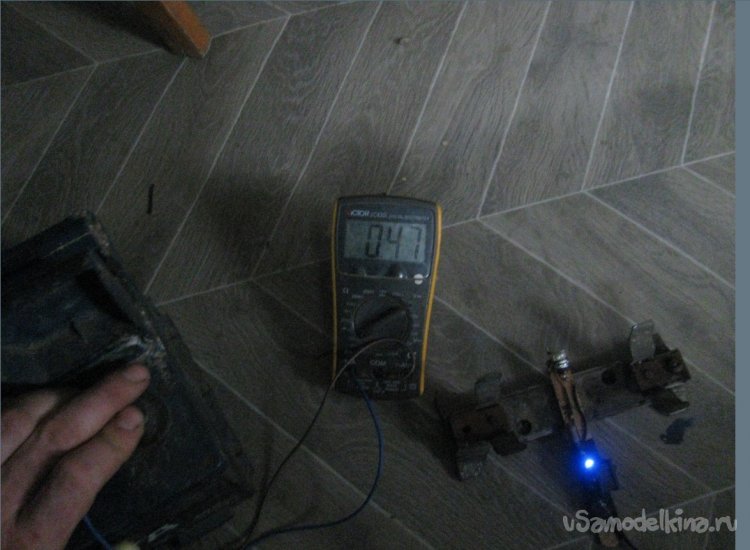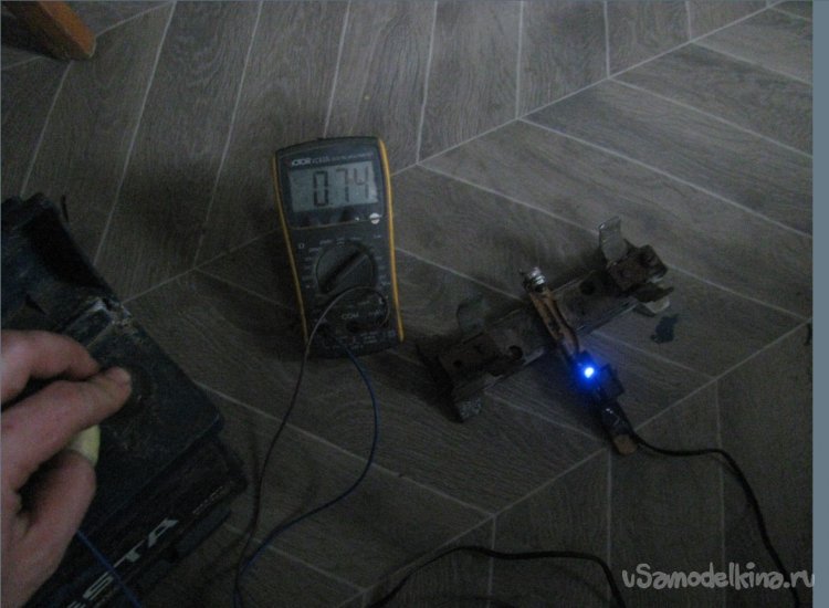Ну, вот и все, подключаем паяльник к аккумулятору, полярность ему не важна, но она важна светодиоду, так что на нужном проводе вяжем узелок. Рабочей температуры паяльник достигает через 1-2 минуты. Паяет самоделка без проблем, теперь будет чем заняться, когда нет света…