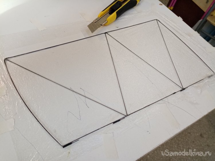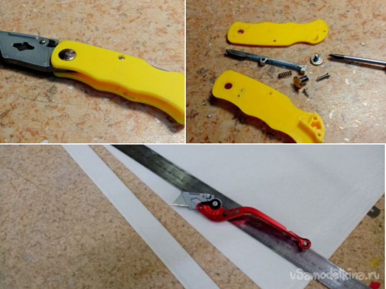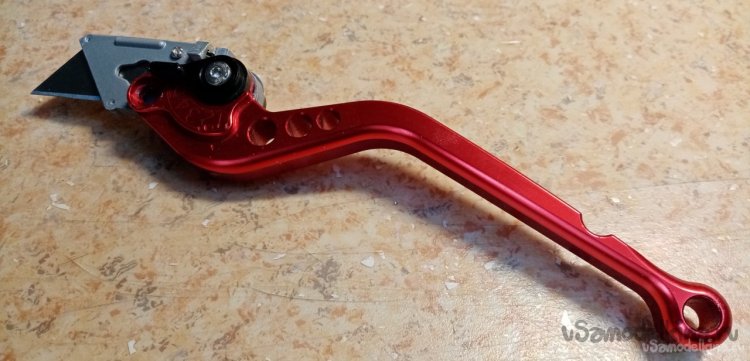 Специальным ножом, изготовленным из мотоциклетного рычага и складешка с ФИКС ПРАЙСа. Начинаю бодро резать толстый двухслойный картон. Некоторое время назад написал статью об изготовлении подобного ножа в качестве подарка. Некоторые товарищи задались вопросом о целесообразности подобной конструкции. Сейчас наглядно объясняю. Такая нестандартная форма идеально подходит для резки плоских заготовок. В том месте, где нужно прилагать значительные усилия. Впрочем, и плоский лист пенопласта он идеально разрезает.