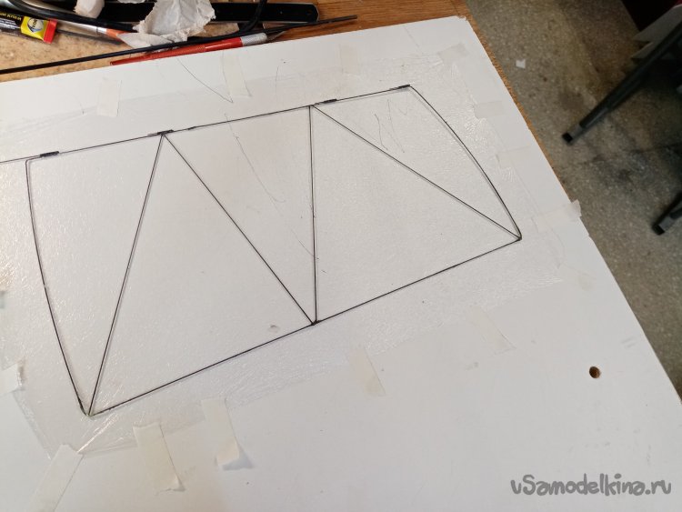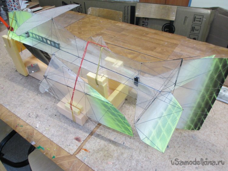 Модель в разобранном виде установлена на стапеле и закреплена связками резинок. Вот эту «окукленную бабочку» предстоит упаковать в еще один кокон.