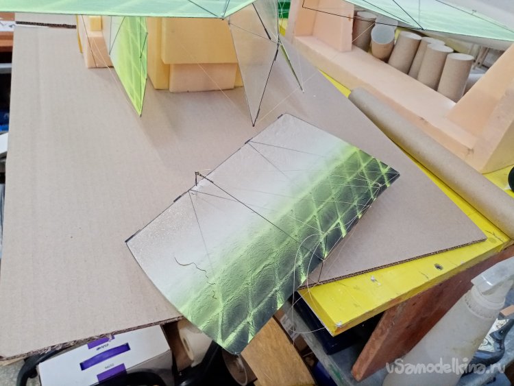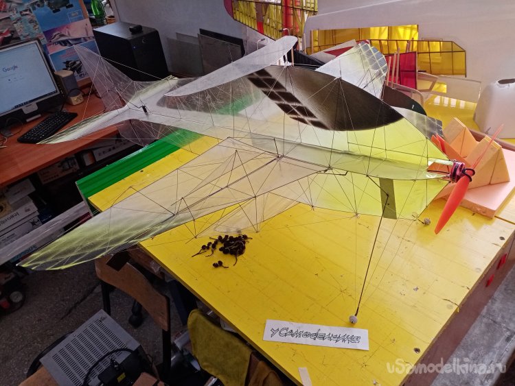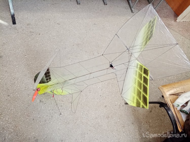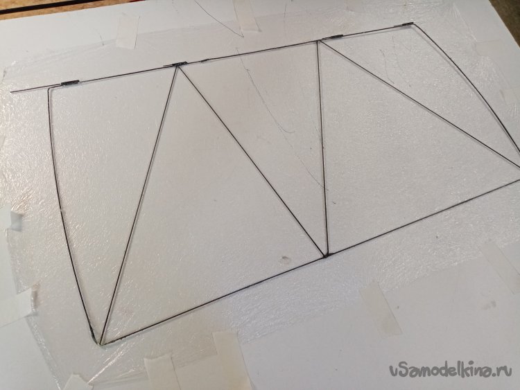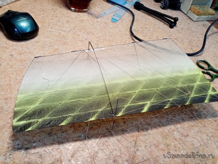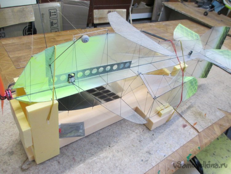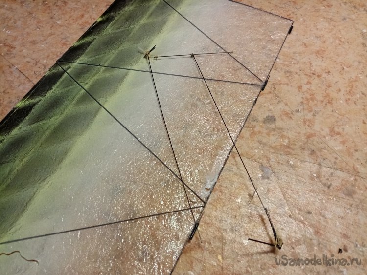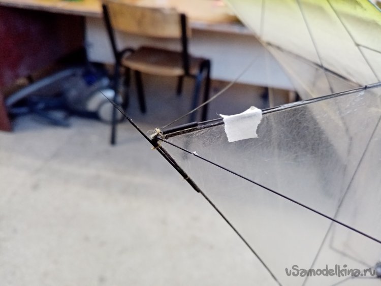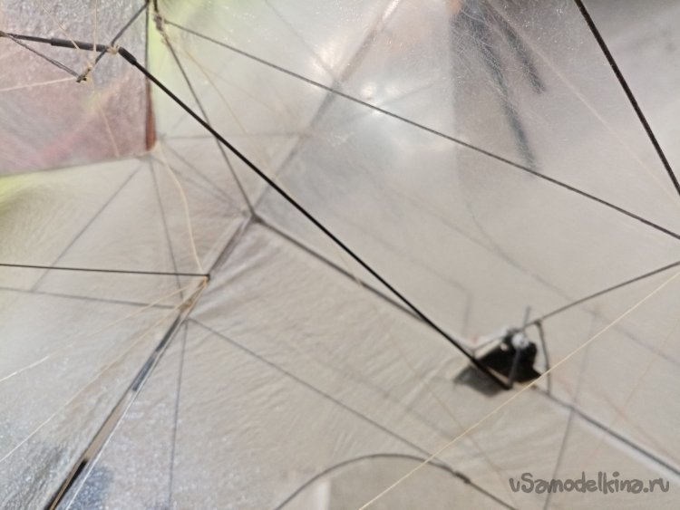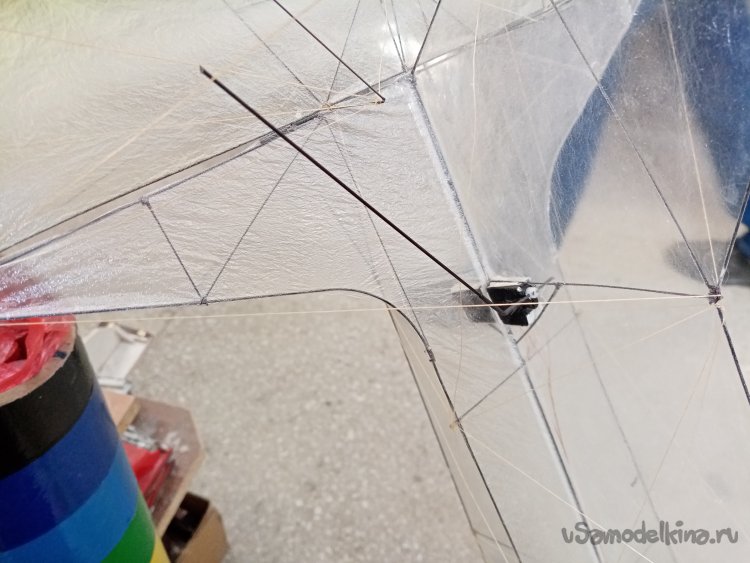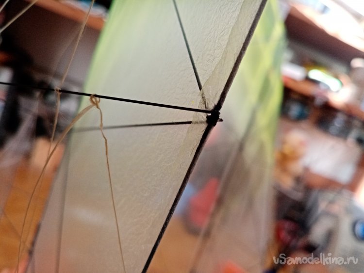 Каркас и растяжки из арамидной нитью смонтированы. Из угольной палочки диаметром в 1 мм сделал приемный кабанчик для тяги управления. Приклеил на каркас циакрином и зафиксировал нитками.