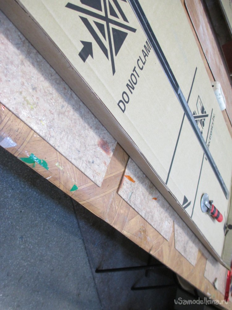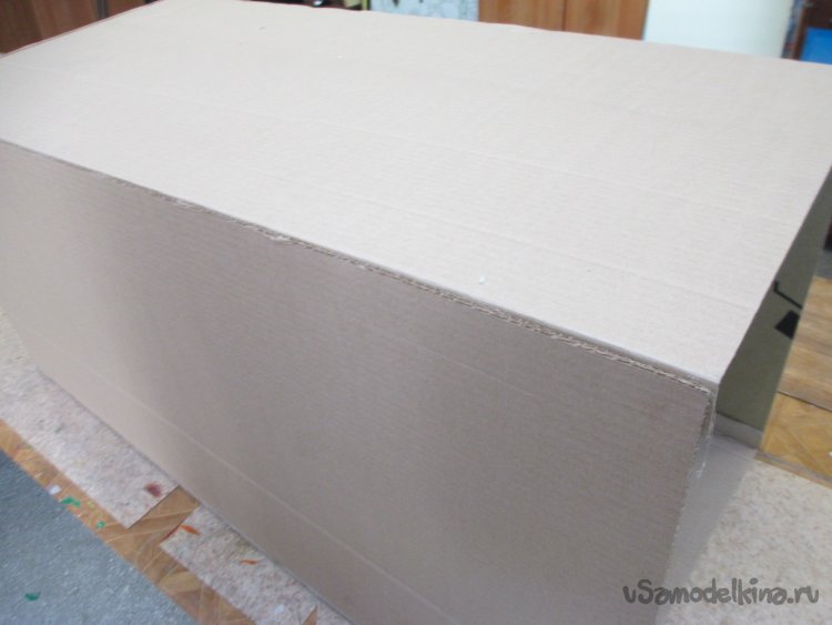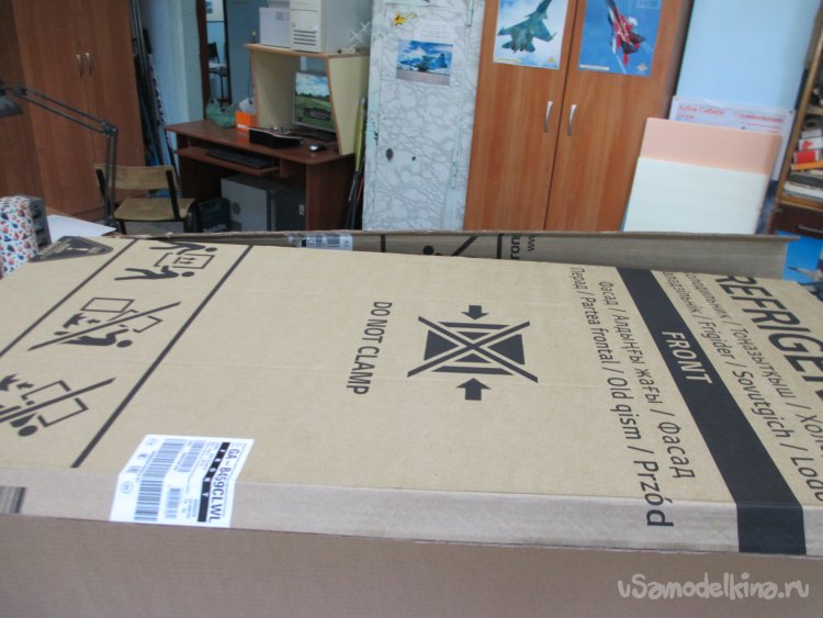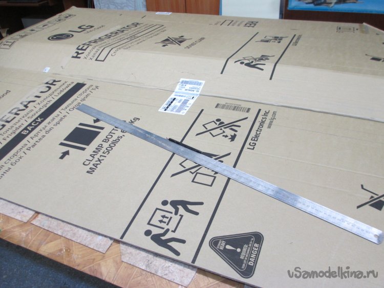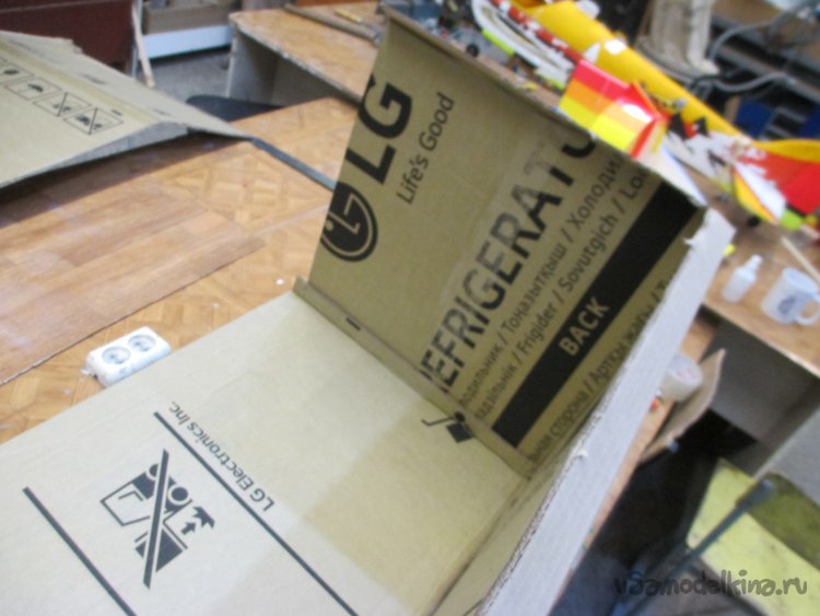 Поскольку самолетик разборный, это хорошо. Габариты упаковки будут несколько меньше. Материал коробочки стандартный, мы всегда используем картон от упаковок холодильников. Начались регулярные обходы «нужных» мест. Сами знаете, каких. Наконец повезло. Притащили большущую коробку, практически целую. Очистили от упаковочного скотча.