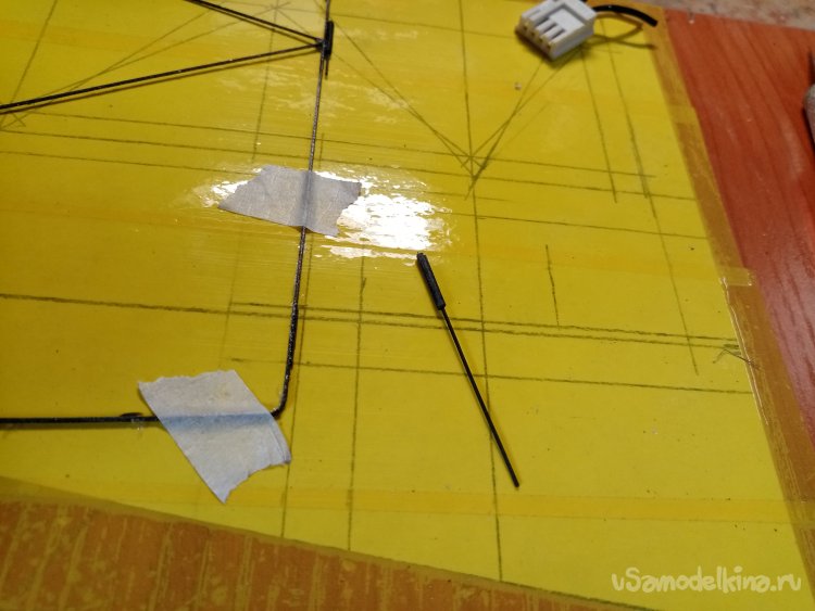 Раму руля приклеиваю на стапель оклеенный скотчем (для защиты от клея). На нужное место приклеиваю скотчем петельку и проливаю циакрином. Для надежности немного соды. Хотя термоусадка отлично клеится. Но решил лучше перебдеть, чем недобдеть. Лишний клей промокнул при помощи клочка туалетной бумаги.