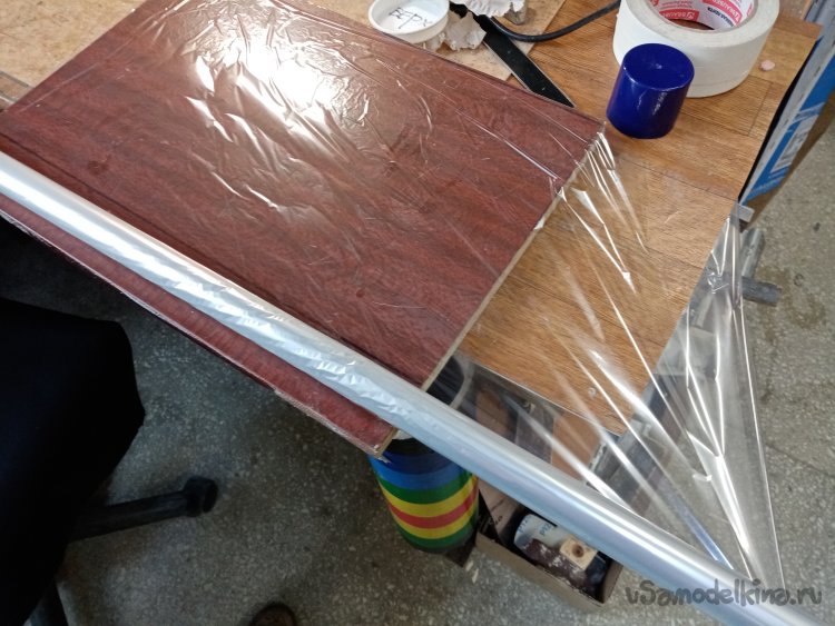 Пленку на каркас наклеиваю клеем спреем 3М 77. Для этой процедуры. Отличный вариант. В малярке включаю вытяжку, прикрываю бумагой стол и распыляю клей на каркас. Очень осторожно снимаю его с защитной бумаги и переношу на пленку. Но есть проблема. Нужно очень ровно положить его на место, без перекосов. Он еще липнет к пальцем, клей очень хороший. После некоторых усилий удалось оторвать руль от руки и плавно опустить на пленку. Нажал клавишу вся спина мокрая.