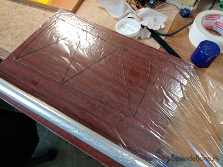 Осторожно обрезаю пленку по контуру с некоторым припуском. Этот припуск буду заворачивать вокруг прутиков по контуру детали. Дл более прочной приклейки. В нож вставил новое лезвие. Задрать токую пленку при резке очень просто.
