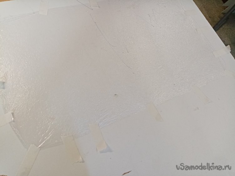Затем отрезок начинаю сминать расправлять, и опять сминать. Долго и тщательно. Мне нужна «супер вмятость». Затем очень осторожно расправляю обшивку, закрепляю на стапеле при помощи малярного скотча. Процедура очень ответственная. Нужно сделать хорошо и равномерно. Недотяну и обшивка, будет провисать при нагрузке. Перетяну, тонкую раму руля согнет в «каральку».