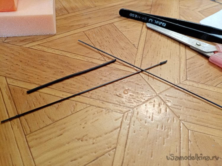 И все тки одну петельку навески повредил. Пришлось изготовить новую. Конструкция состоит из термоусадки диаметром в 1 мм, угольного прутика в 0.5 мм. Отрезаю трубочку термоусадки нужной длины, одеваю на прутик с нанесенным циакрином и аккуратно осаживаю при помощи термофена. Температуру ставлю в 190 градусов. И так петелька готова.