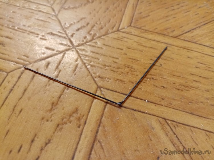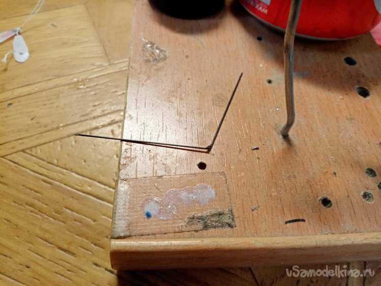 Одна распорка полностью вышла из строя. Нужно изготовить новую. Отрезаю прутик диаметром 0.5 мм. Сгибаю его в нужном месте при помощи жала паяльника. Температура установлена в 180 градусов. Капаю на перегиб немного циакрина, для прочности. Устанавливаю на место поврежденного.
