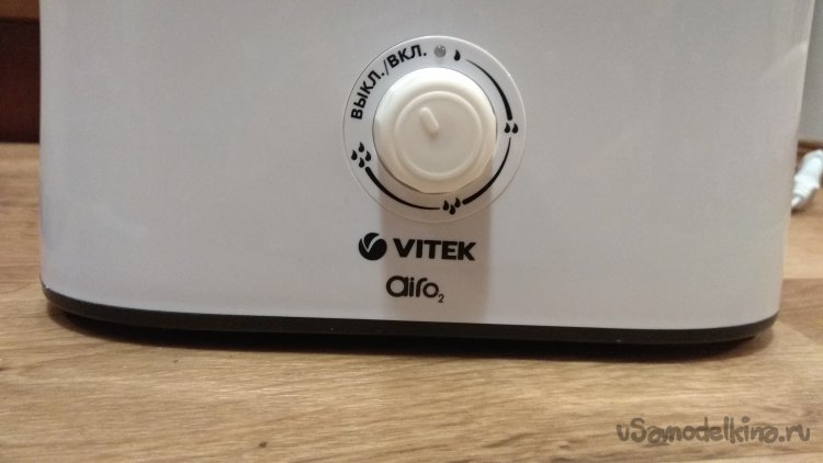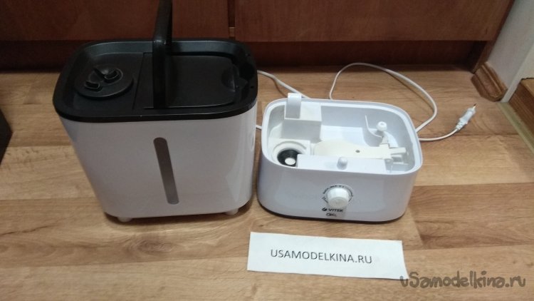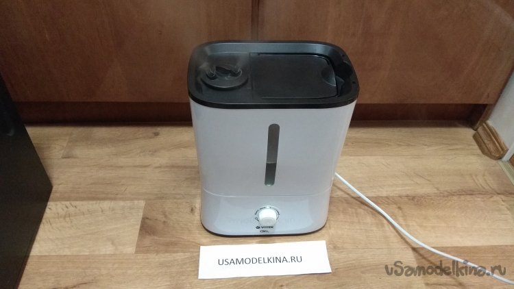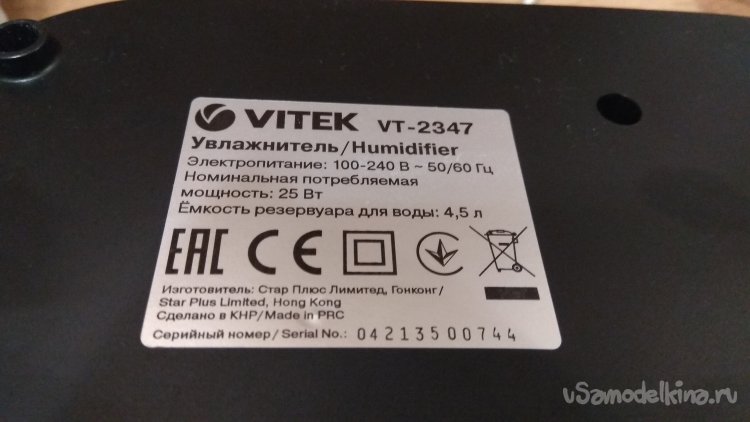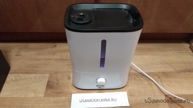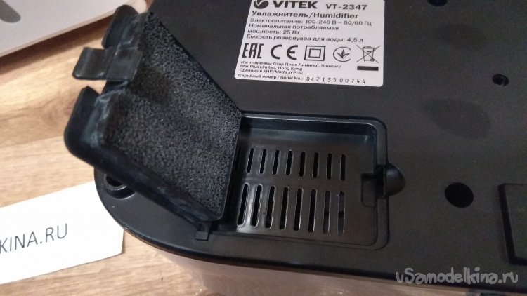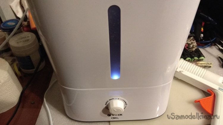 Первый ультразвуковой увлажнитель я собрал самостоятельно. О нем есть статья на сайте. Всю зиму он работал исправно, на следующий год появились проблемы с ультразвуковым излучателем, он банально не хотел распылять воду, появлялся только маленький фонтанчик практически без распыления. Не проблема подумал я, есть пара запасных излучателей. Но и они быстро вышли из строя, буквально через неделю. Конструкция излучателя неразборная, все залито компаундом, что там ломается непонятно. Терпеть сухость не стал, как и заказывать новые излучатели, все равно ждать их месяц-два, пока приедут, купил увлажнитель. Выбора в магазине особо не было, всего две модели, купил ту, что больше понравилось - Vitek VT-2347. Мощность 25 Вт, обслуживаемая площадь 30 м2, производительность 200 мл/час, объем резервуара 4,5 л!, есть индикация отсутствия воды.