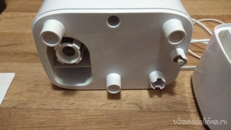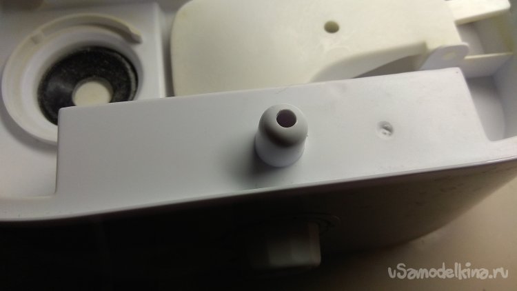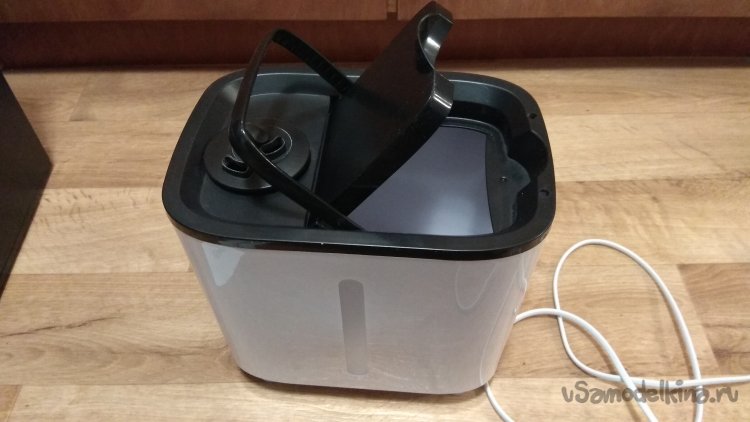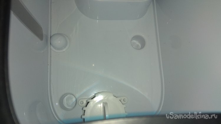 Конструкция увлажнителя позволяет добавлять воду сверху через крышку прямо в процессе эксплуатации. Для этого в баке имеется клапан, на который давит рычаг поплавка в нижней камере, вода налилась до уровня, поплавок поднялся, клапан пружиной закрылся.