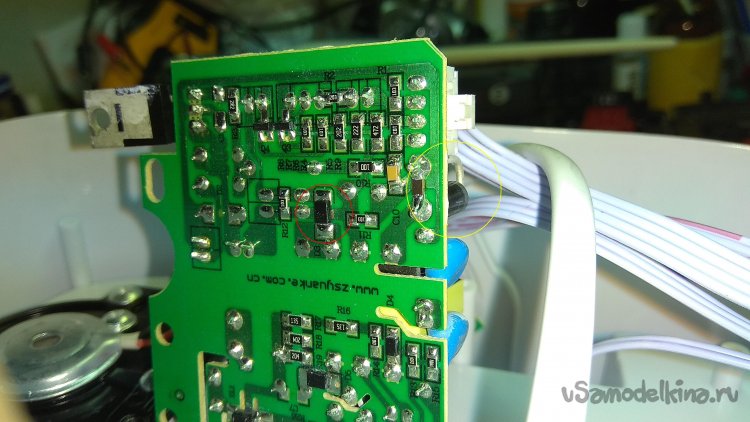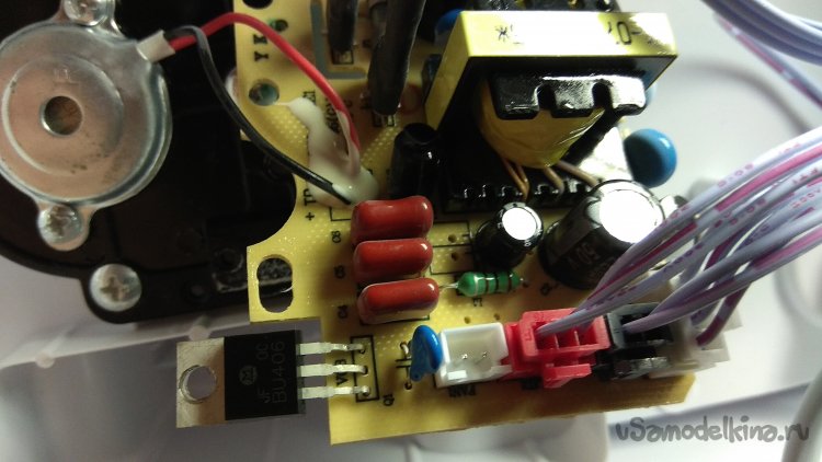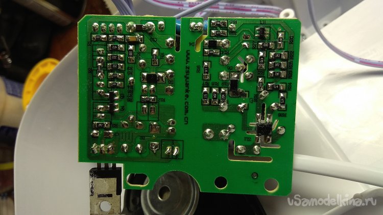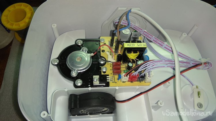 На плате имеется место под разъем 12В, судя по отверстиям на дне корпуса, есть модификации с датчиком влажности и (или) температуры. На разъеме постоянно присутствует 12В. Блок питания в увлажнителе работает постоянно, выключается только ультразвуковой генератор и вентилятор.