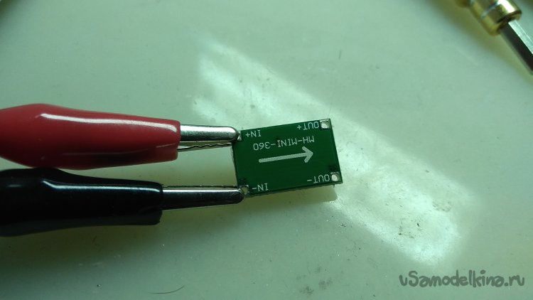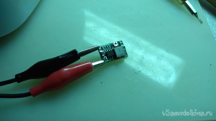 Для нормальной работы RGB светодиода необходим ток около 20 мА, при этом падение напряжения на нем около 3,5 В (измерения характеристик белого и RGB светодиодов). Для ограничения тока можно конечно воспользоваться резистором, но я выбрал понижающий преобразователь напряжения. Выставил на нем 3,5 В.