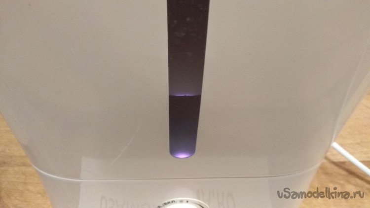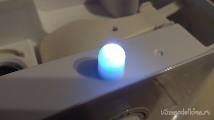 Заливаю дистиллированную воду (хоть и дорого, но не хочу больше налета на мебели и носоглотке) проверяю, как светится с водой. В темноте светится не особо ярко, что очень хорошо, не будет мешать спать.